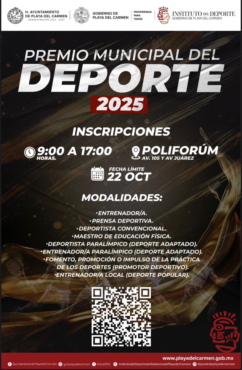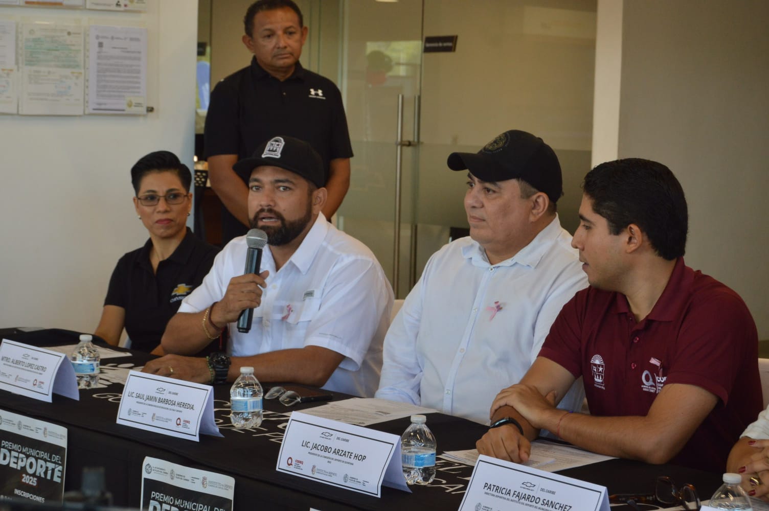 Playa del Carmen, Quintana Roo, 1 de octubre de 2025.– Como parte de la estrategia integral para fortalecer el deporte y reconocer a quienes destacan en esta materia, el gobierno municipal, que encabeza la presidenta Estefanía Mercado, lanzó la convocatoria al Premio Municipal del Deporte 2025, en un acto encabezado por el regidor presidente de la Comisión de Salud, Educación y Deporte, Saúl Barbosa, y el director del Instituto Municipal del Deporte, Alberto López.