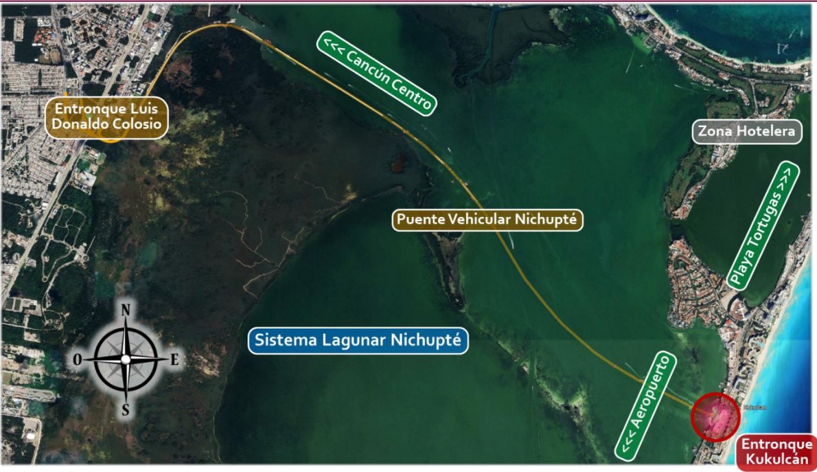 •  La obra de un distribuidor vial con paso elevado se considera complementaria del todavía inconcluso Puente Vehicular Nichupté, para evitar el congestionamiento del tránsito en su entronque en el Boulevard Kukulkán
