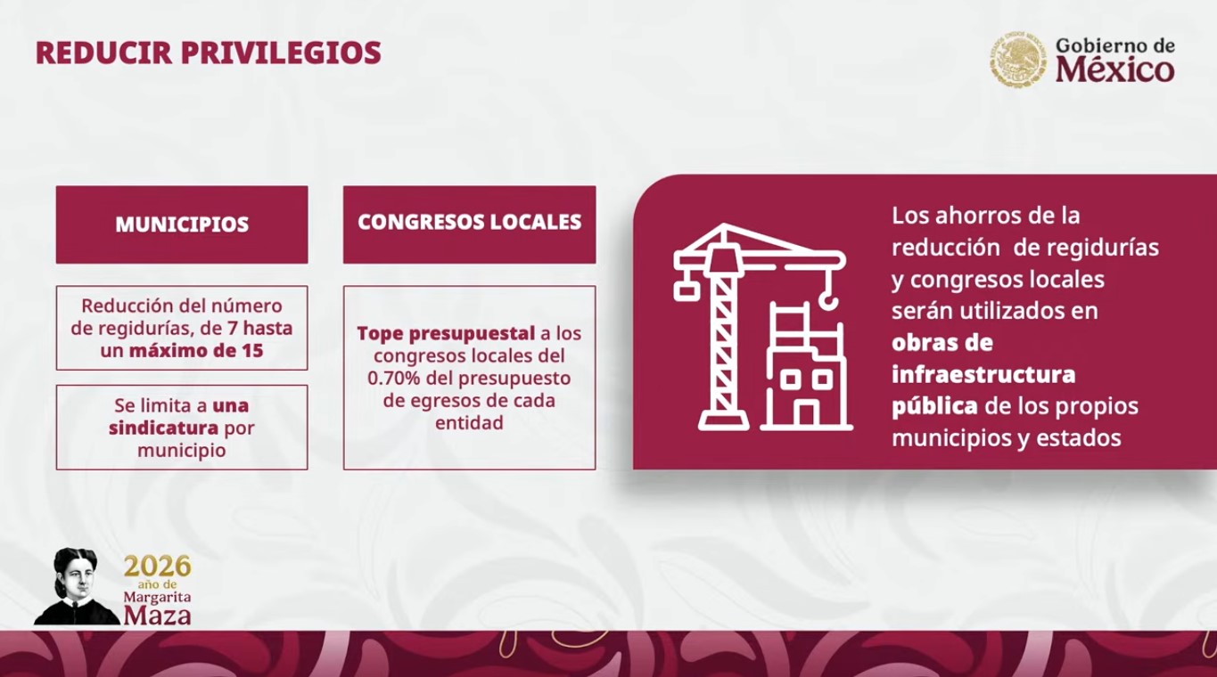 La presidenta de México, Claudia Sheinbaum Pardo dijo que pedirá limitar de 7 a 15 los regidores de los ayuntamientos, a 0.7 % del presupuesto total el gasto de los congresos estatales y poder adelantar su revocación de mandato a 2027