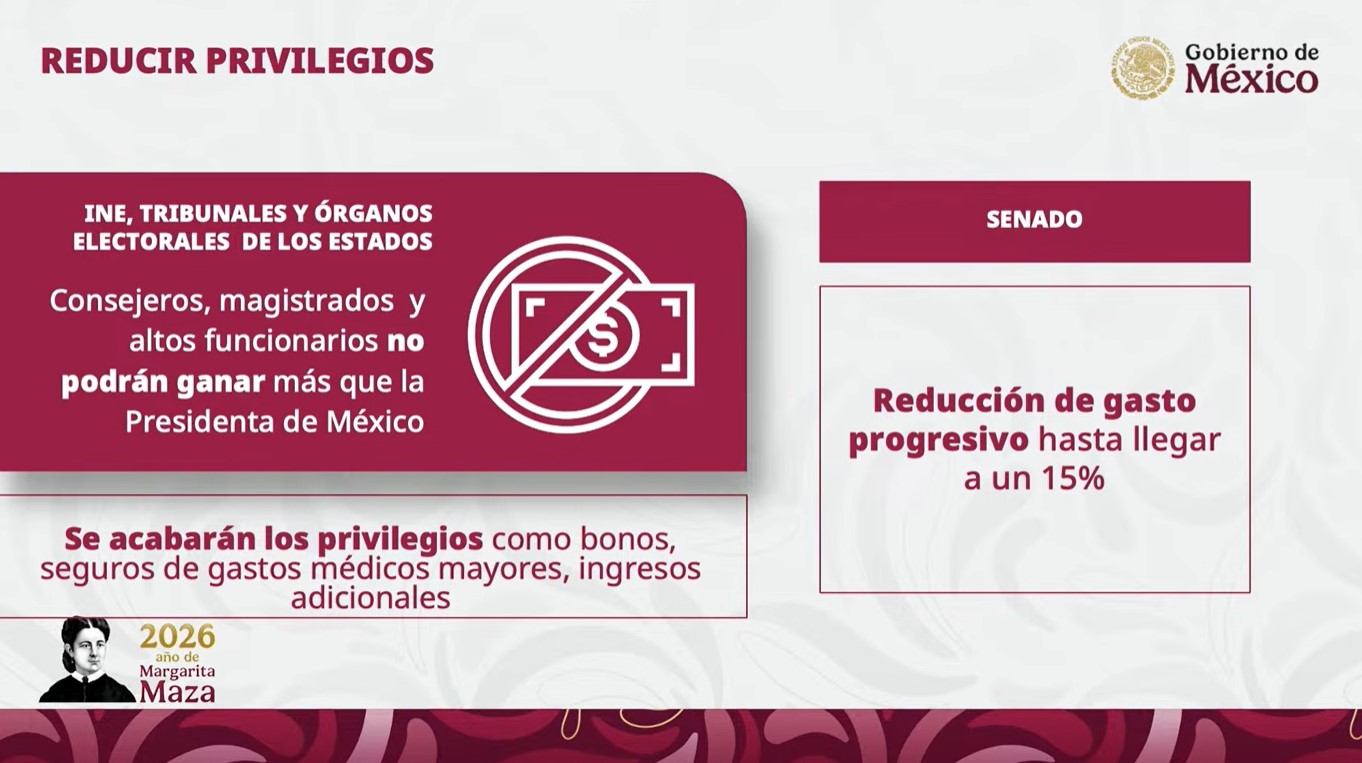 – Consejeros, magistrados, altos funcionarios no podrán ganar más que la Presidenta de México. Se acaban los bonos, seguro de gastos médicos mayores e ingresos adicionales.