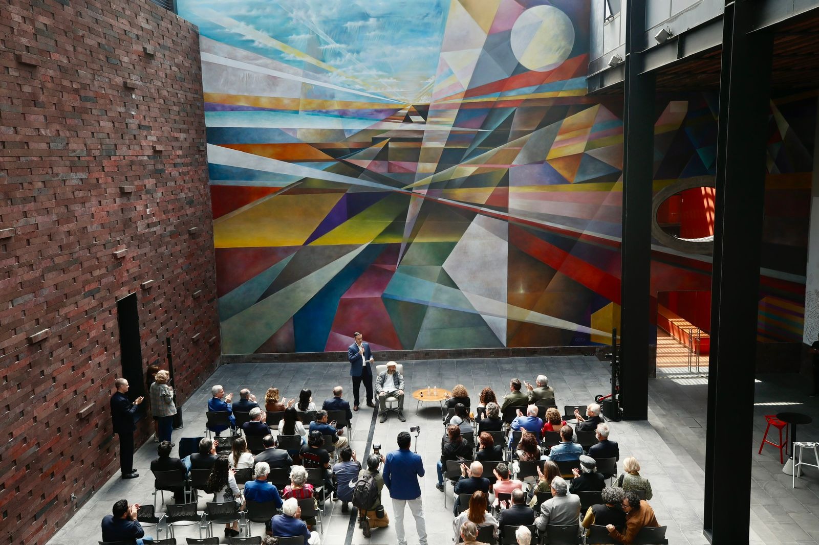 El mural ofrece un estallido geométrico y cromático que sugiere desplazamientos, fugas, tensiones y equilibrios. En ello confluyen el dominio del espacio, la experimentación formal y una visión profundamente filosófica del tiempo: el pasado, el presente y el porvenir entrelazados en una dimensión pictórica.