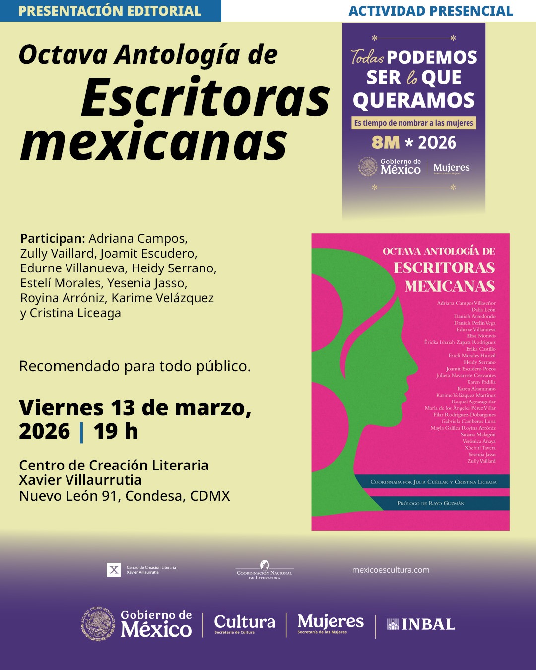 La Octava Antología de Escritoras Mexicanas será presentada por las autoras Adriana Campos, Zully Vaillard, Joamit Escudero, Edurne Villanueva, Heidy Serrano, Estelí Morales, Yesenia Jasso, Royina Arróniz, Karime Velázquez y Cristina Liceaga.