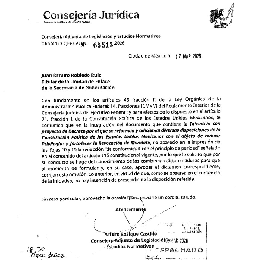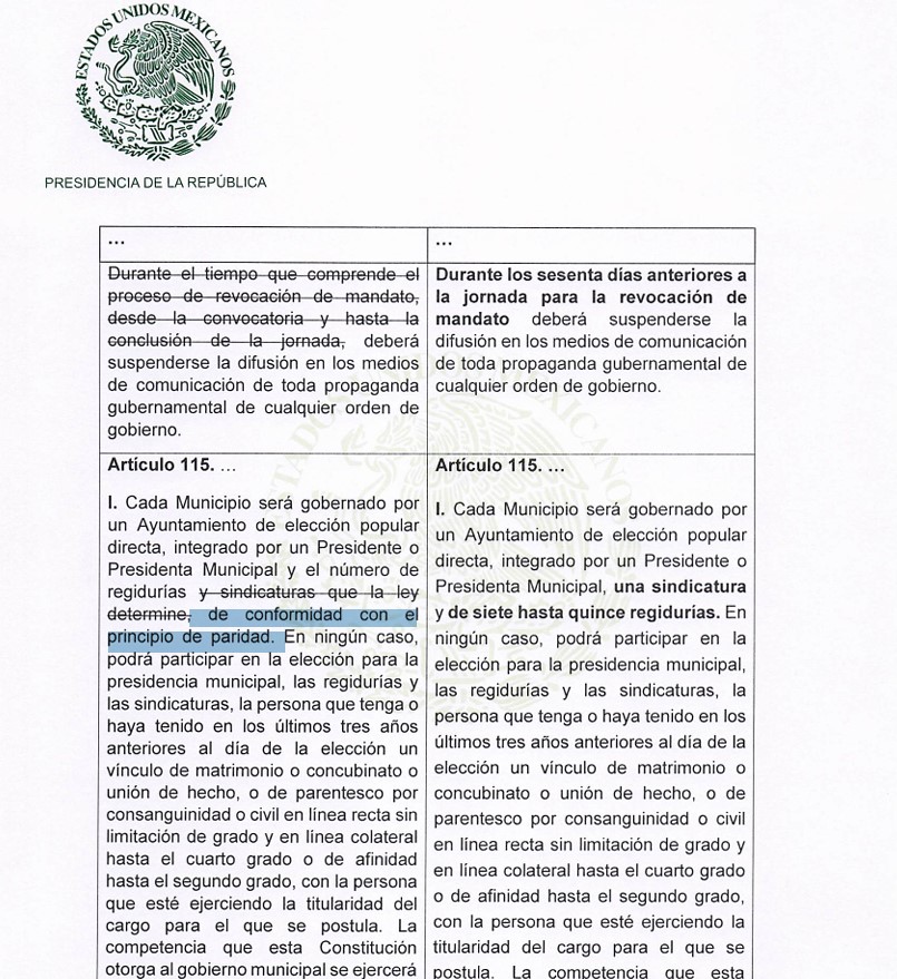 Dice el oficio que “en la integración del documento que contiene la iniciativa con proyecto de Decreto por el que se reforman y adicionan diversas disposiciones de la Constitución Política de los Estados Unidos Mexicanos con el objeto de reducir privilegios y fortalecer la revocación de mandato, no apareció en la impresión de las fojas 10 y 15 la redacción ‘de conformidad con el principio de paridad’ señalado en el contenido del artículo 115 constitucional vigente, por lo que le solicito que por su conducto se haga del conocimiento de las comisiones dictaminadoras para que al momento de formular y, en su caso, aprobar el dictamen correspondiente, corrijan esta omisión. Lo anterior, en virtud de que, como se observa en el contenido de la iniciativa, no hay intención de prescindir de la disposición referida”.