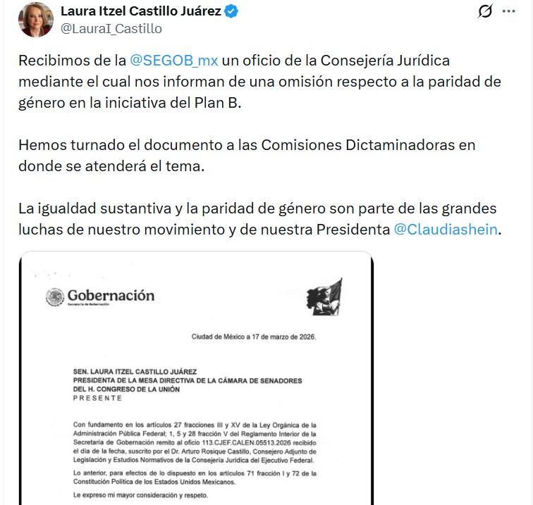 CIUDAD DE MÉXICO, 18 de marzo.- La presidenta de México, Claudia Sheinbaum Pardo, a través de su Consejería Jurídica, presentó al Senado de la República un oficio en el que reconoce haber borrado por error de la iniciativa del Plan B la paridad de género en la integración de los ayuntamientos y le pide corregir su omisión.