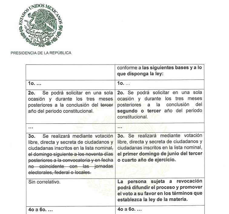 Este rasurado de la iniciativa final se hizo con el propósito de asegurar que los aliados voten con Morena para que la presidenta pueda estar en las boletas y hacer campaña en la elección del 2027, al permitir en la Constitución que la consulta de revocación de mandato se pueda realizar en el tercer año de gobierno, coincidente con las elecciones federal y locales, y que la presidenta pueda pedir el voto a su favor.