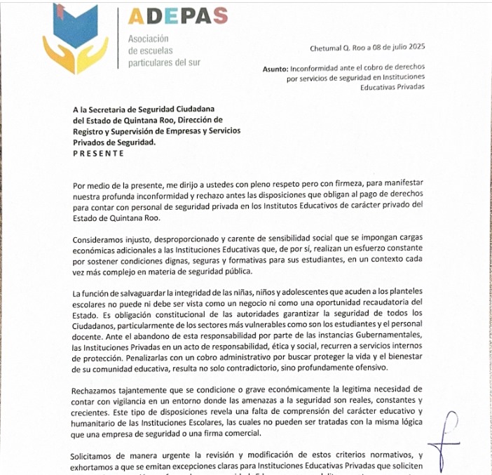 CHETUMAL, 9 de julio. – La Asociación de Escuelas Particulares del Sur de Quintana Roo (ADEPAS) denunció formalmente ante la Secretaría de Seguridad Ciudadana del Estado una medida que calificó como injusta y desproporcionada, como lo es el cobro de derechos por contar con personal que abre y cierra las puertas en instituciones educativas privadas. El señalamiento apunta directamente al titular de la dependencia, Julio César Gómez Torres, quien, de acuerdo con el posicionamiento firmado por 29 escuelas, ha equiparado dicha función con labores de seguridad privada.