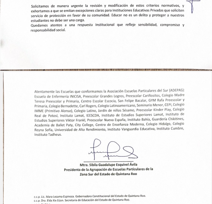 La agrupación que integra escuelas como el Colegio Latino, CEPI, el Instituto Lamat, IMME y otros centros educativos de Chetumal y Bacalar, exhortó a la autoridad estatal a revisar y modificar los criterios normativos, además de solicitar excepciones claras para instituciones educativas cuyo objetivo es garantizar la integridad de niñas, niños y adolescentes.