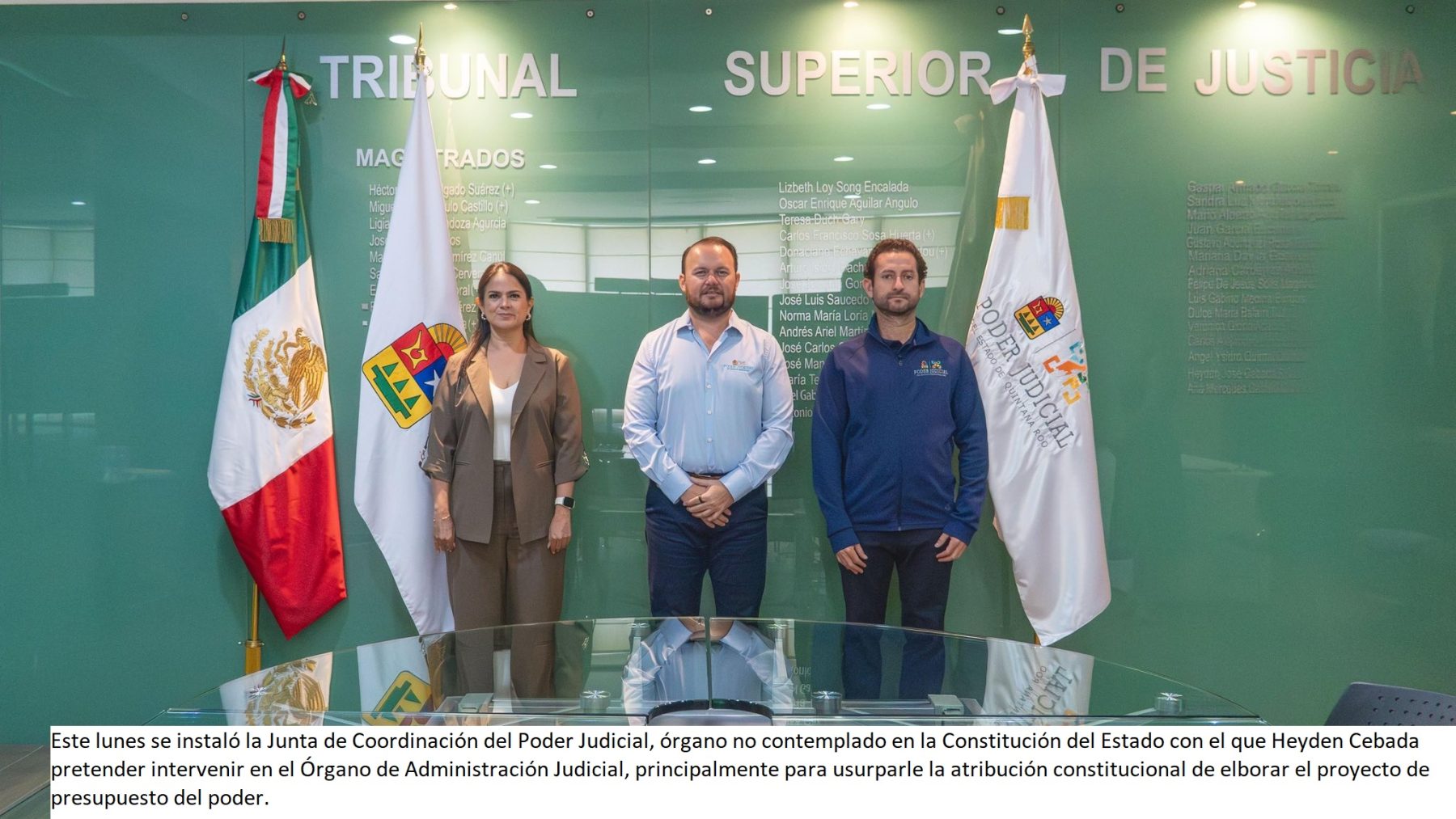 Además, para contar con un vehículo formal que le permita inmiscuirse en los asuntos que son exclusiva atribución de los nuevos Tribunal de Disciplina Judicial y del Órgano de Administración de Justicia, en la nueva Ley Orgánica Heyden Cebada también impulsó que se creara una figura que no está prevista en la Constitución del Estado, que es la Junta de Coordinación del Poder Judicial, misma que fue instalada este lunes 8 de septiembre.