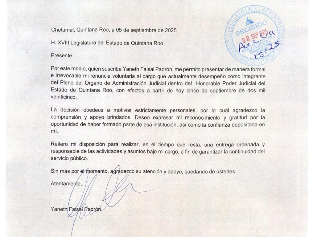 La renuncia de Faisal Ponce fue ingresada este día en la sesión ordinaria del Congreso del Estado, y en ella se dice que Faisal Padrón renunció a su cargo en el Órgano de Administración Judicial con efectos a partir del pasado 5 de septiembre, por lo que el puesto lleva 4 días acéfalo al día de hoy.