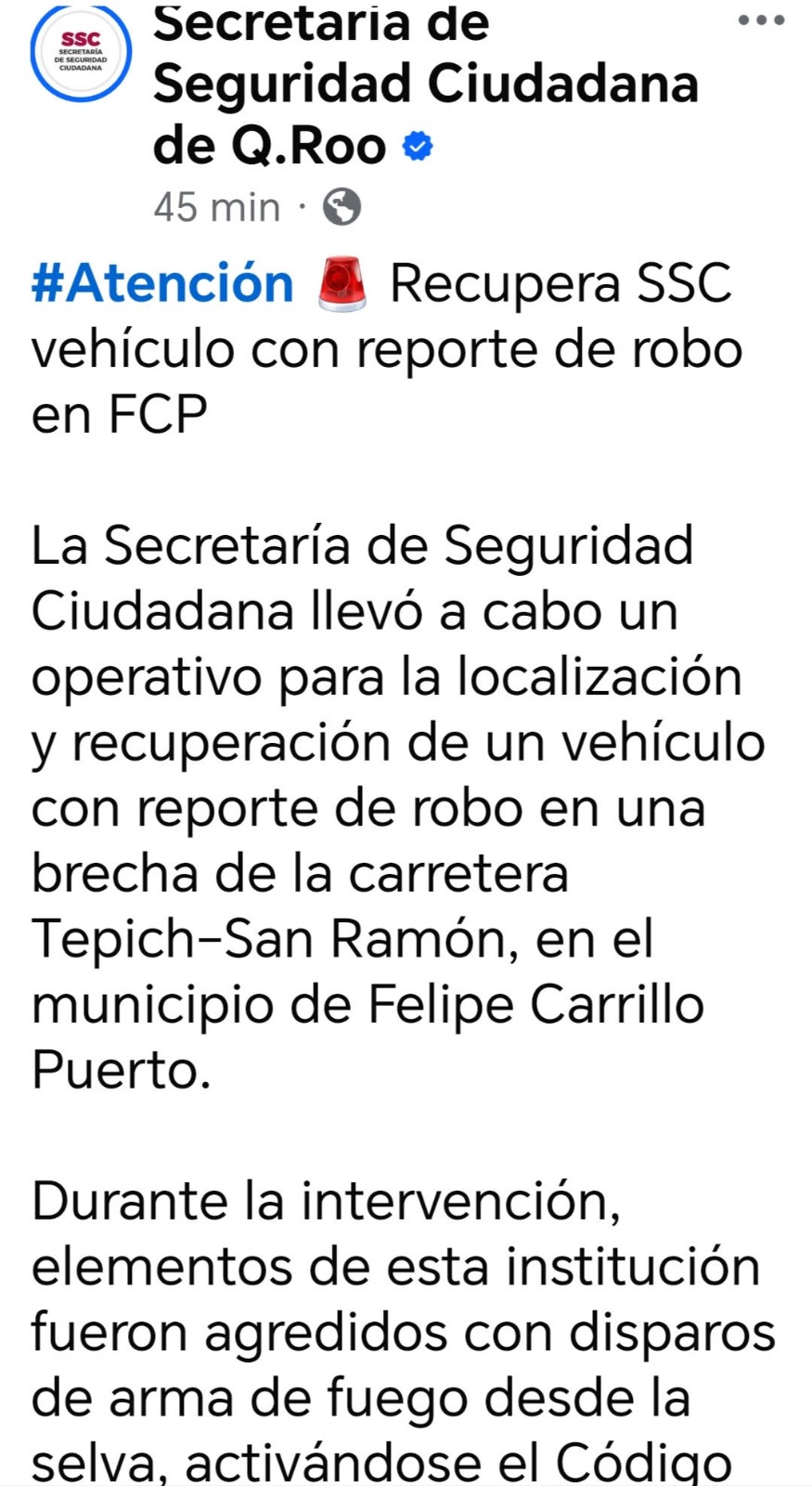 Felipe Carrillo Puerto, 15 de febrero. – Resulta inaudito y profundamente indignante, que la Secretaría de Seguridad Ciudadana de Quintana Roo haya emitido un comunicado donde el encabezado y el foco principal sea la recuperación de un vehículo con reporte de robo, dejando como una nota secundaria el fallecimiento de uno de sus elementos.