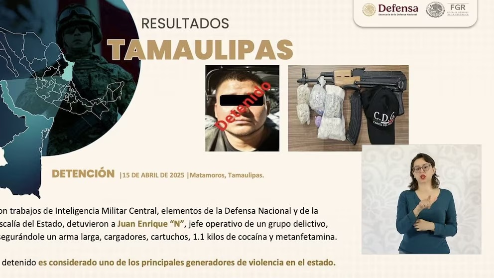 “Se realizó el arresto de Juan Enrique “N”, alias “Escorpión”, jefe operativo de célula delictiva “Los Escorpiones”, vinculados con “Los Ciclones” del cártel del Golfo. El detenido era considerado uno de los principales generadores de violencia en el estado”, comentó el funcionario durante una conferencia del pasado 22 de abril.