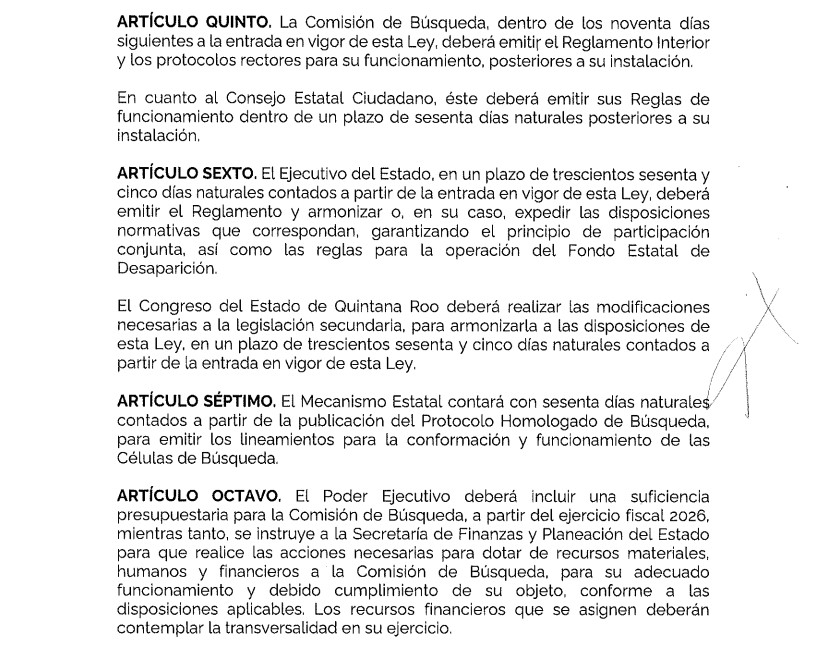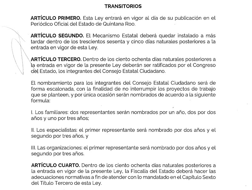 Otros plazos son muy largos, pues pesar de que argumenta que urge atender el problema, también contradictoriamente la iniciativa propone un plazo de hasta un año después de la entrada en vigor de la ley para instalar el Mecanismo Estatal de Coordinación en Materia de Búsqueda de Personas, no obstante que estaría integrado por dependencias y agencias ya existentes, pues lo presidiría la titular de la Comisión Estatal de Búsqueda de Personas, con la participación de la Secretaría de Gobierno (Segob), la Secretaría de Seguridad Ciudadana (SSC), la Fiscalía General del Estado (FGE), la Fiscalía Especializada en Desaparición de Personas, la Dirección General de Servicios Periciales, la Comisión Ejecutiva de Atención a Víctimas (Ceaveqroo), tres representantes de un nuevo Consejo Ciudadano en Materia de Desaparición de Personas, un integrante del Poder Legislativo y un magistrado del Poder Judicial.
