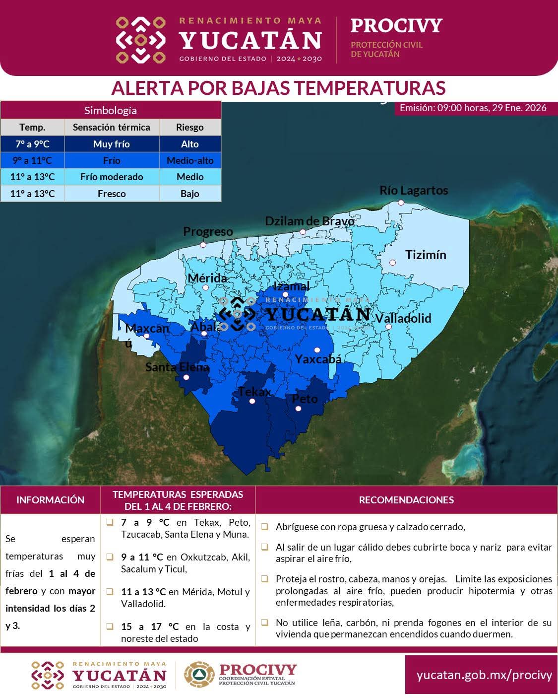 Los modelos de análisis del Centro Estatal de Monitoreo y Alertamiento señalan que el sur del estado será la región con valores más bajos, con temperaturas mínimas estimadas entre 7 y 9 grados Celsius en municipios como Tekax, Peto, Tzucacab, Santa Elena y Muna, zonas donde históricamente se registran los descensos térmicos más marcados durante la temporada invernal.
