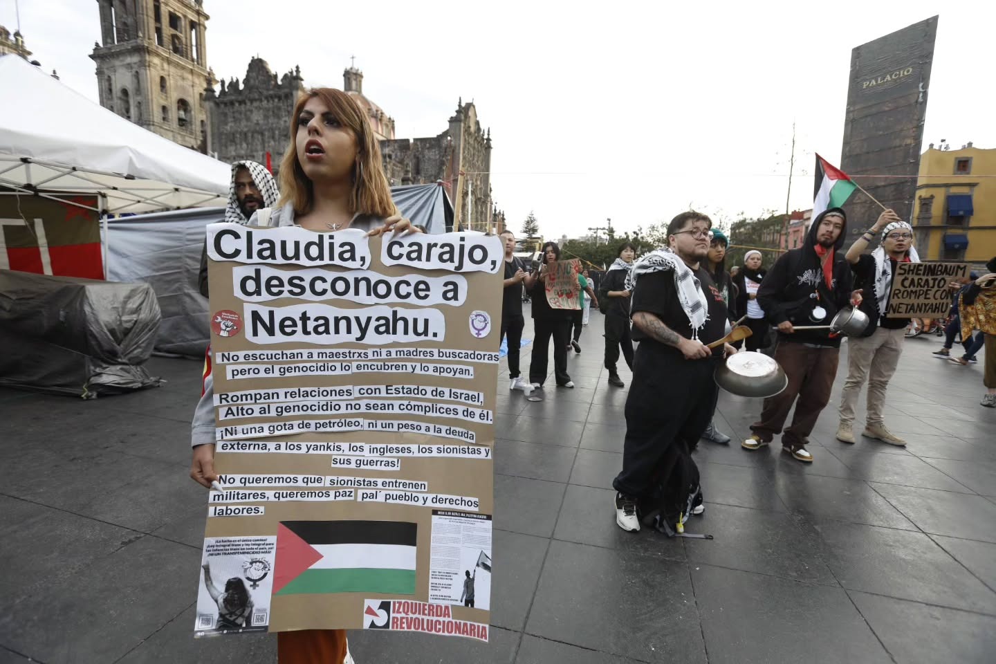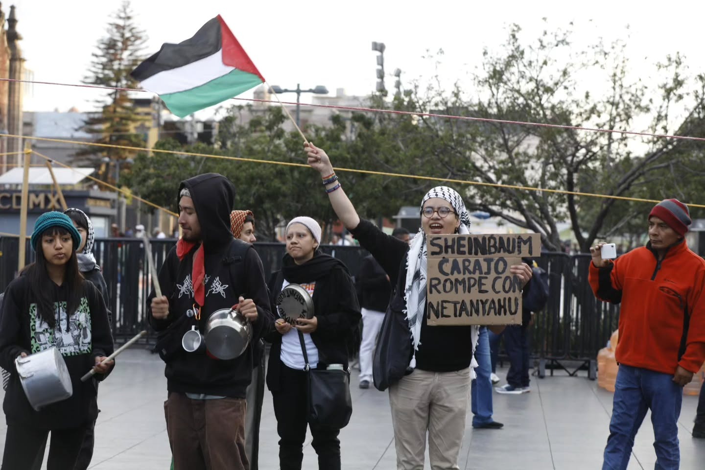 Un grupo de jóvenes universitarios realizó un cacerolazo frente a Palacio Nacional para exigir que el gobierno mexicano rompa toda relación con el Estado de Israel, al que acusan de cometer un genocidio en la Franja de Gaza.