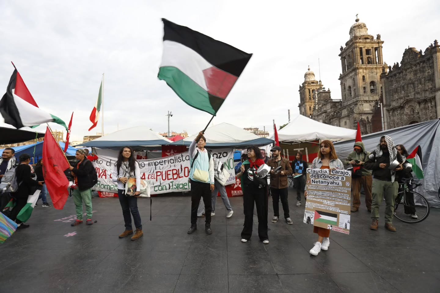 La protesta fue encabezada por unos 35 integrantes de la Asamblea Interuniversitaria y Popular con Palestina, quienes se concentraron en el costado oriente del Zócalo capitalino.