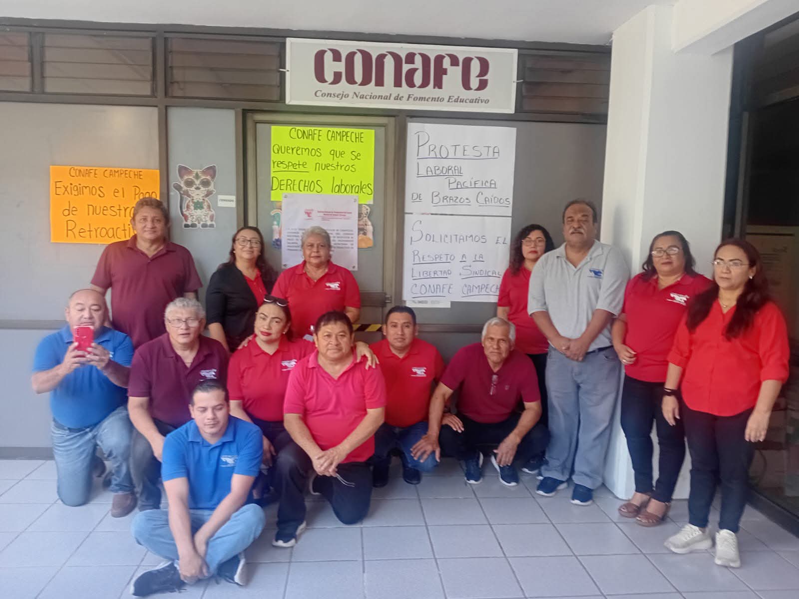San Francisco de Campeche, Cam., 7 de noviembre.- En demanda de que les sea incrementado el salario, trabajadores sindicalizados de CONAFE Campeche protestaron la mañana de este viernes, en las instalaciones de la institución, ubicadas en el Centro Histórico de Campeche.