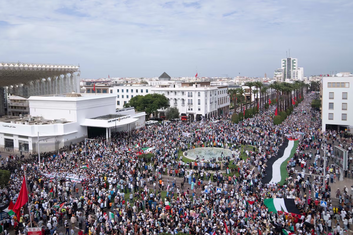 Convocada por el Frente Marroquí de Apoyo a Palestina y Rechazo a la Normalización, la marcha denunció el regreso del crimen israelí contra el enclave costero y rechazó los planes de desplazamiento forzado del pueblo palestino.