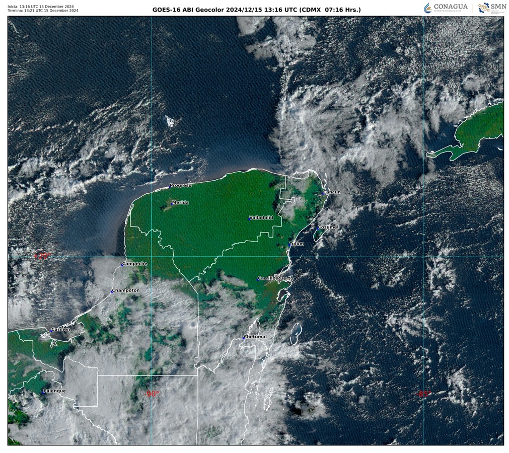 De manera general, un canal de baja presión en el sureste mexicano, en combinación con la entrada de humedad del mar Caribe, ocasionarán en Quintana Roo cielo medio nublado durante el día, con chubascos ocasionales de 5 a 25 mm en zonas de la entidad. Ambiente cálido a caluroso por el día, templado a fresco en horas nocturnas y viento del noreste de 15 a 25 km/h con rachas de 40 a 50 km/h en costas de la entidad.