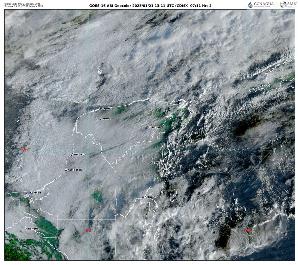 La sinopsis meteorológica informa que el frente frío No. 24 se extenderá sobre el oriente del golfo de México y, en interacción con un canal de baja presión sobre la península de Yucatán, originarán en Quintana Roo cielo medio nublado a nublado y lluvias fuertes con puntuales muy fuertes de 50 a 75 mm, acompañadas de actividad eléctrica.