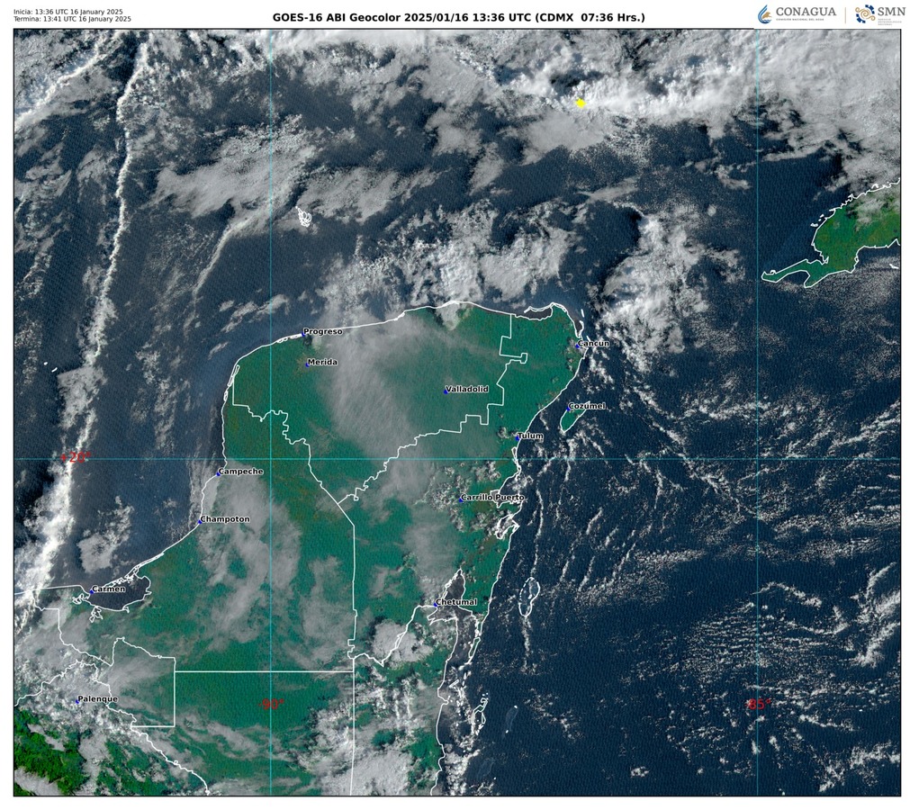 Aunado a la entrada de humedad proveniente del golfo de México y del mar Caribe, propiciarán en Quintana Roo cielo medio nublado a nublado y probabilidad de intervalos de chubascos con lluvias puntuales fuertes de 25 a 50 mm en zonas de la entidad. Ambiente diurno caluroso, templado a fresco durante la noche y viento del noroeste y norte de 10 a 25 km/h con rachas de hasta 40 km/h.