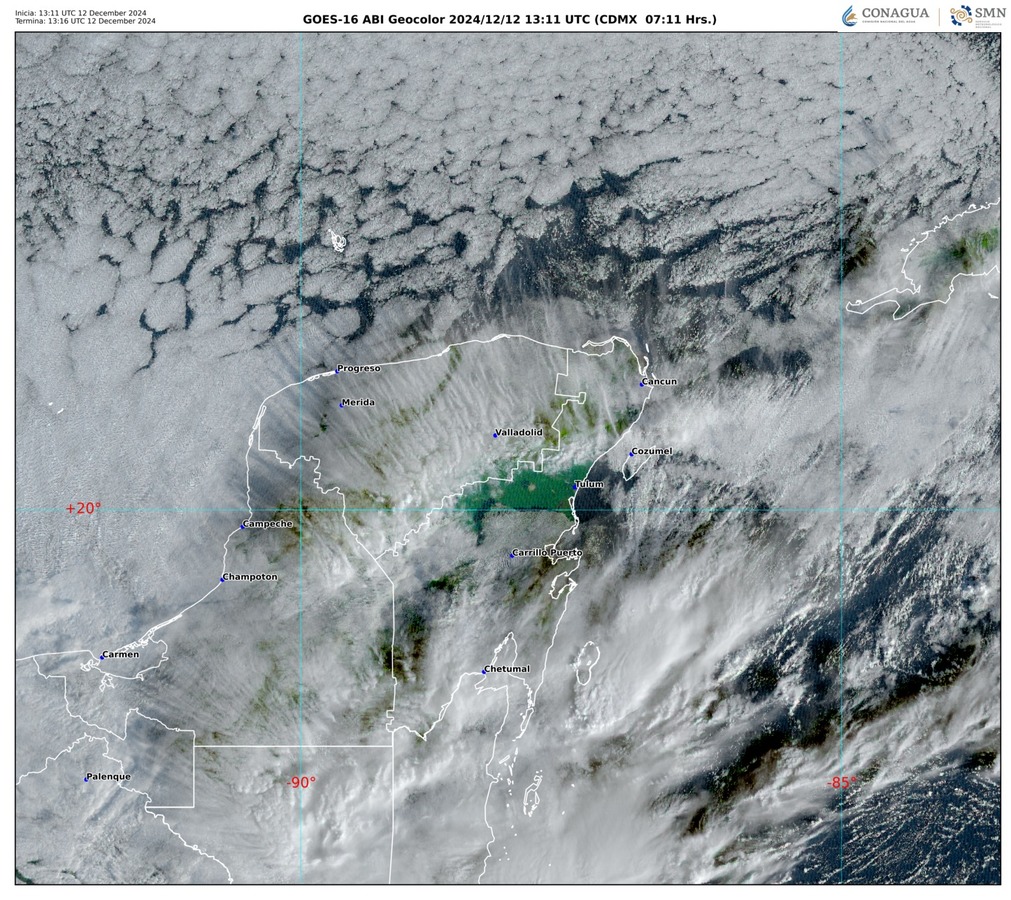 El Servicio Meteorológico Nacional (SMN) dio a conocer que la masa de aire frío que impulsa al frente # 14, aunado a un canal de baja presión que se extenderá sobre el oriente de la península de Yucatán, propiciarán en Quintana Roo cielo medio nublado a nublado y probabilidad de chubascos con lluvias puntuales fuertes de 25 a 50 mm sobre zonas del estado.