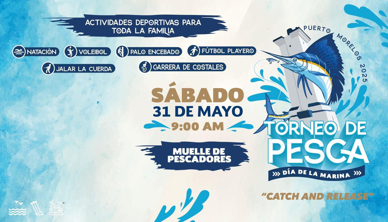 Este Torneo de Pesca Deportiva Puerto Morelos 2025 con motivo del -Día de la Marina-, se llevará a cabo a partir de las 9:00 horas de este sábado 31 de mayo, teniendo como punto de salida y de llegada para las embarcaciones participantes el Muelle de Pescadores portomorelense.