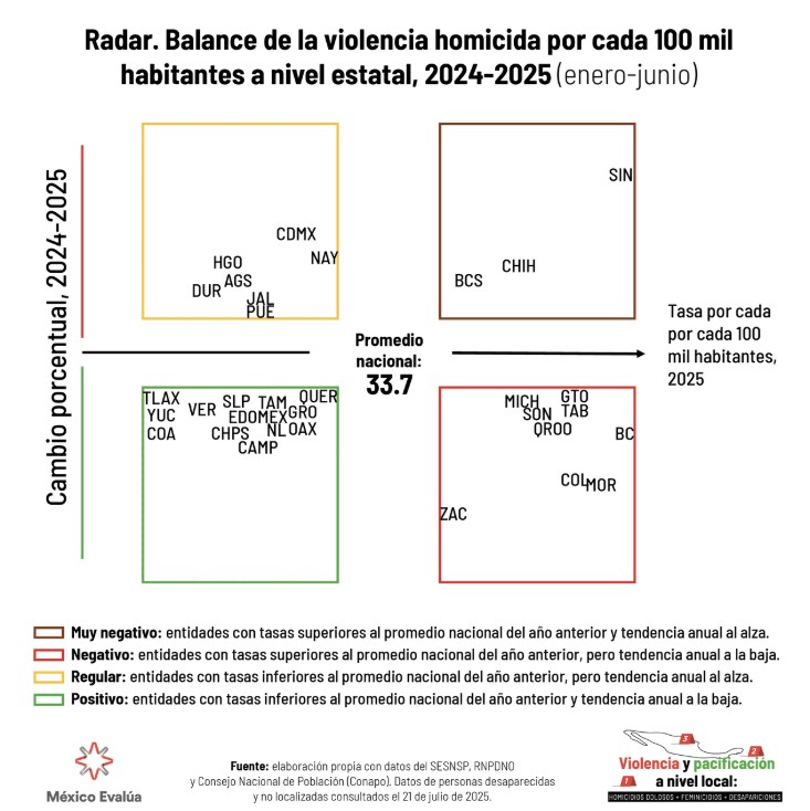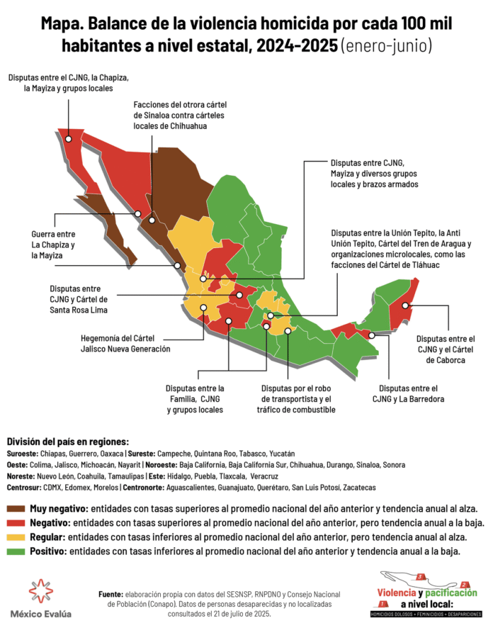 Sin embargo, México Evalúa advierte que una baja intensidad de conflicto armado no debe interpretarse como ausencia de criminalidad, ya que pueden persistir fenómenos como el cobro de piso o la infiltración institucional sin violencia visible.