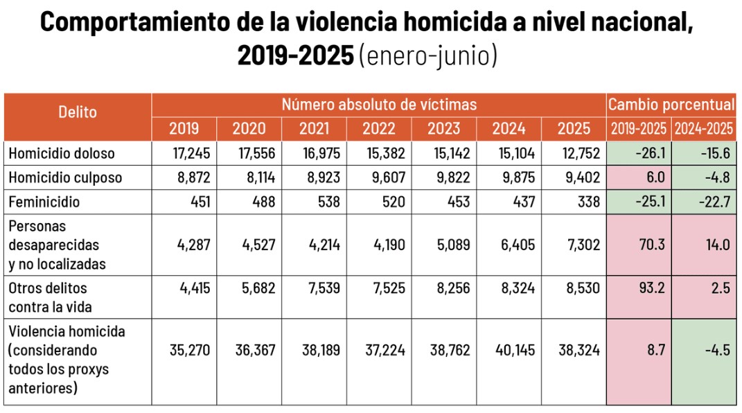 “Lo anterior se ve reflejado en anomalías en el comportamiento de los datos. De 2024 a 2025, considerando los registros del primer semestre, las víctimas de homicidio doloso disminuyeron 15.6 %. Sin embargo, en el mismo periodo, las víctimas de otros delitos contra la vida aumentaron 2.5 %, y las personas desaparecidas en 14 %.