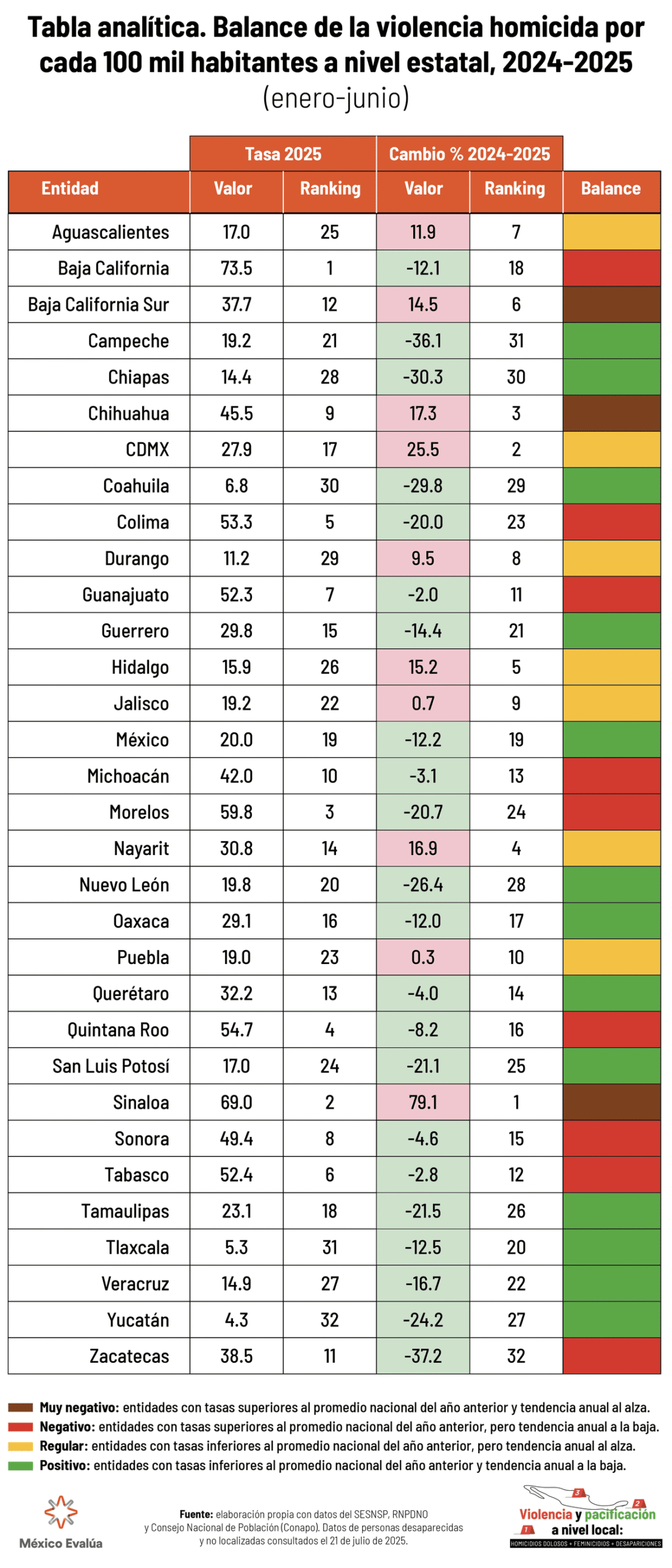 En contraste, en el Top 5 de estados con la tasa más baja de violencia homicida de enero a junio del 2025 están: Yucatán (4.3), Tlaxcala (5.3), Coahuila (6.8), Durango (11.2) y Chiapas (14.4).