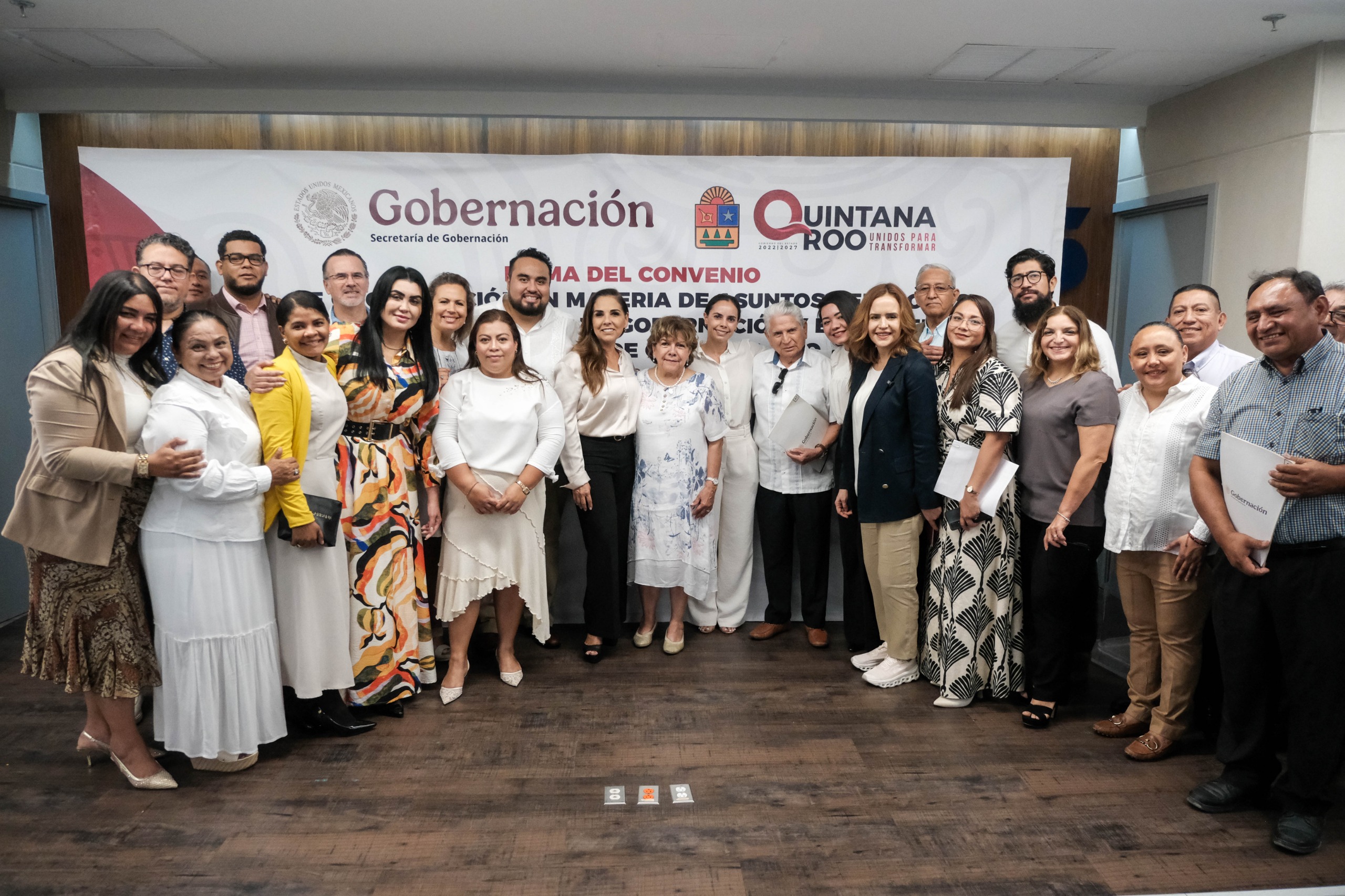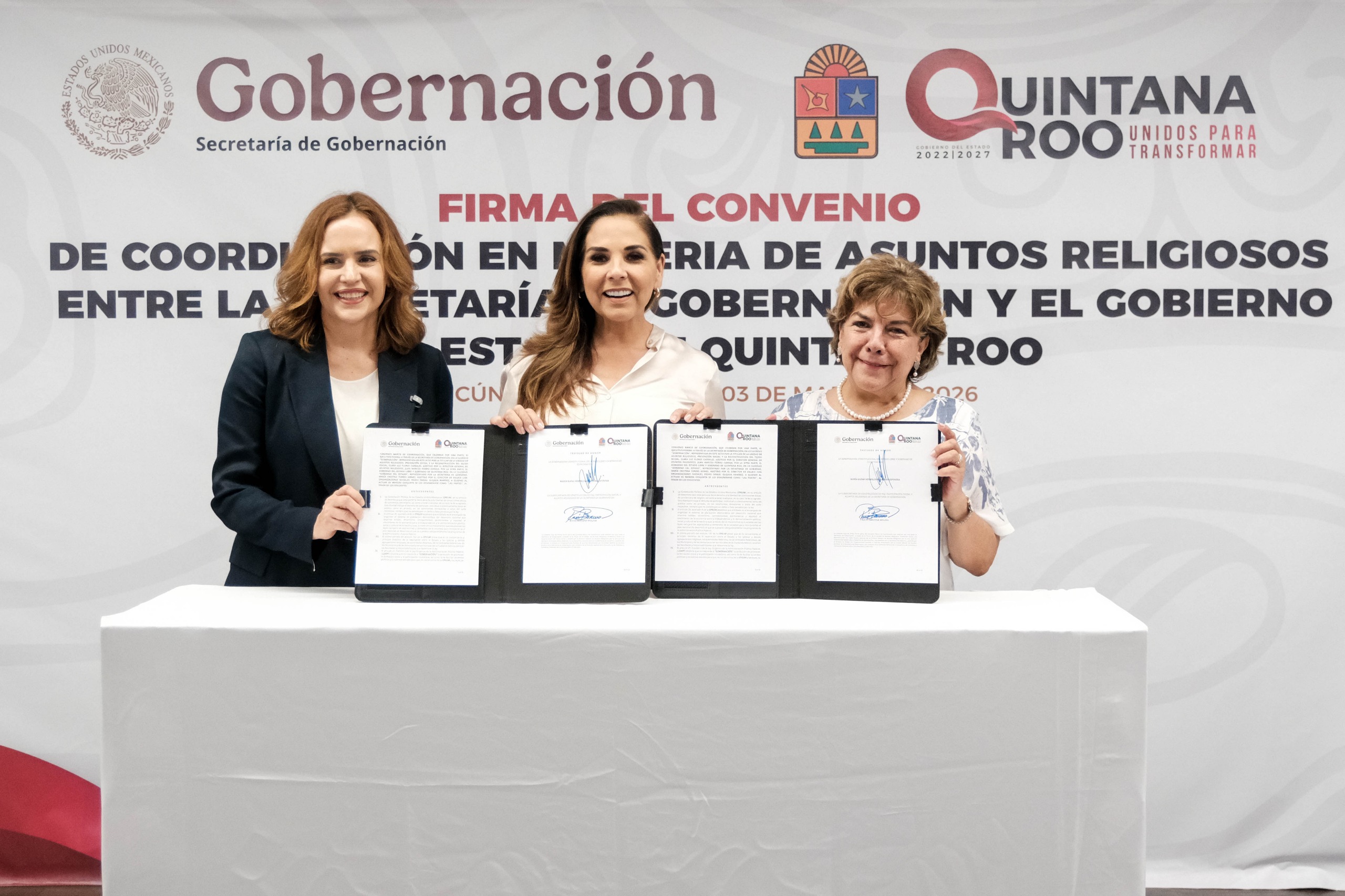 Previamente, la secretaria de Gobierno de Quintana Roo, Cristina Torres Gómez, explicó que el instrumento jurídico firmado es una actualización del Convenio de Coordinación suscrito en 2005 y que establecía acciones conjuntas orientadas a la promoción de la tolerancia religiosa, la cultura de paz y el respeto a la diversidad de creencias en la entidad.