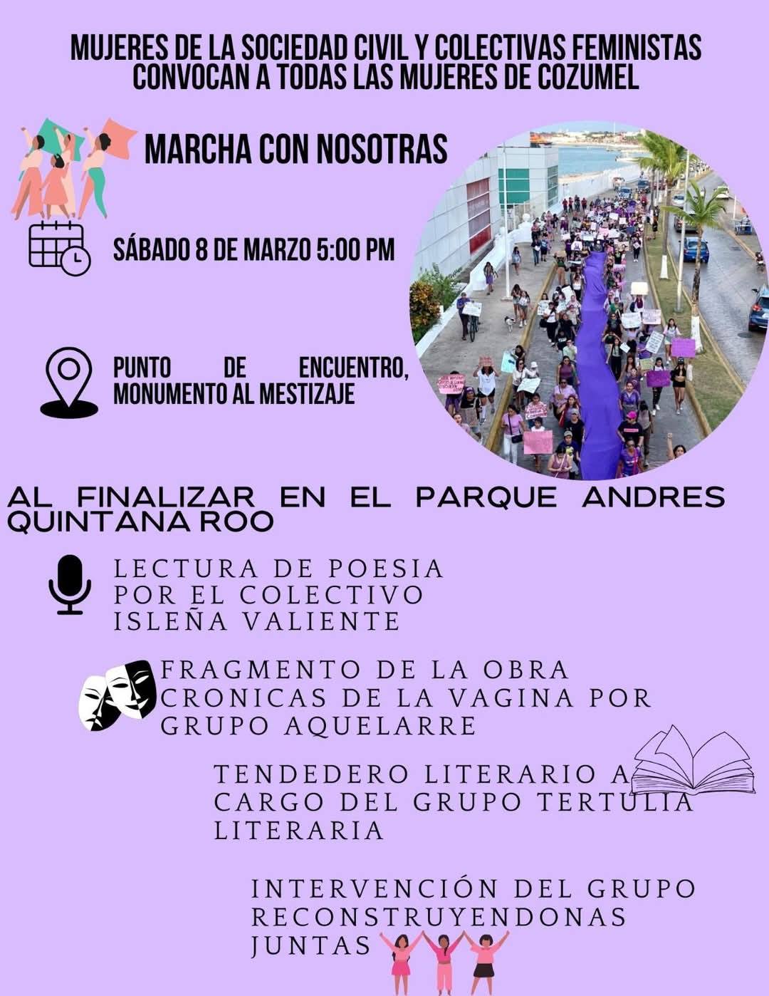 En Chetumal, la capital del estado se espera una de las movilizaciones más grandes con una marcha separatista que partirá del Museo de la Cultura Maya a las 5:30 pm En Cozumel, mujeres de la sociedad civil y colectivas han organizado una marcha desde el Monumento al Mestizaje, seguida de actividades culturales y de denuncia, como la lectura de poesía y un tendero literario.