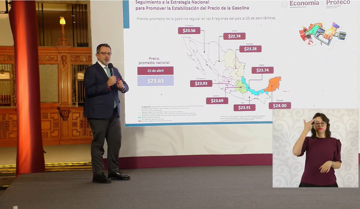 Iván Escalante, titular de la Profeco, detalló que, en el sureste del país, Campeche, Quintana Roo y Yucatán presentan los precios más elevados de gasolina regular o Magna, con 24 pesos en promedio por litro, mientras el promedio nacional es de 23.63 pesos.
