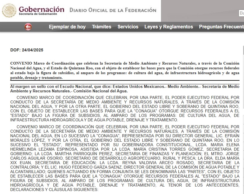 Con las bases de este convenio, publicado en el Diario Oficial de la Federación (DOF), el gobierno federal otorgará recursos federales establecidos en el Presupuesto de Egresos de la Federación al estado para programas de cultura del agua, de infraestructura hidroagrícola y de agua potable, drenaje y tratamiento.