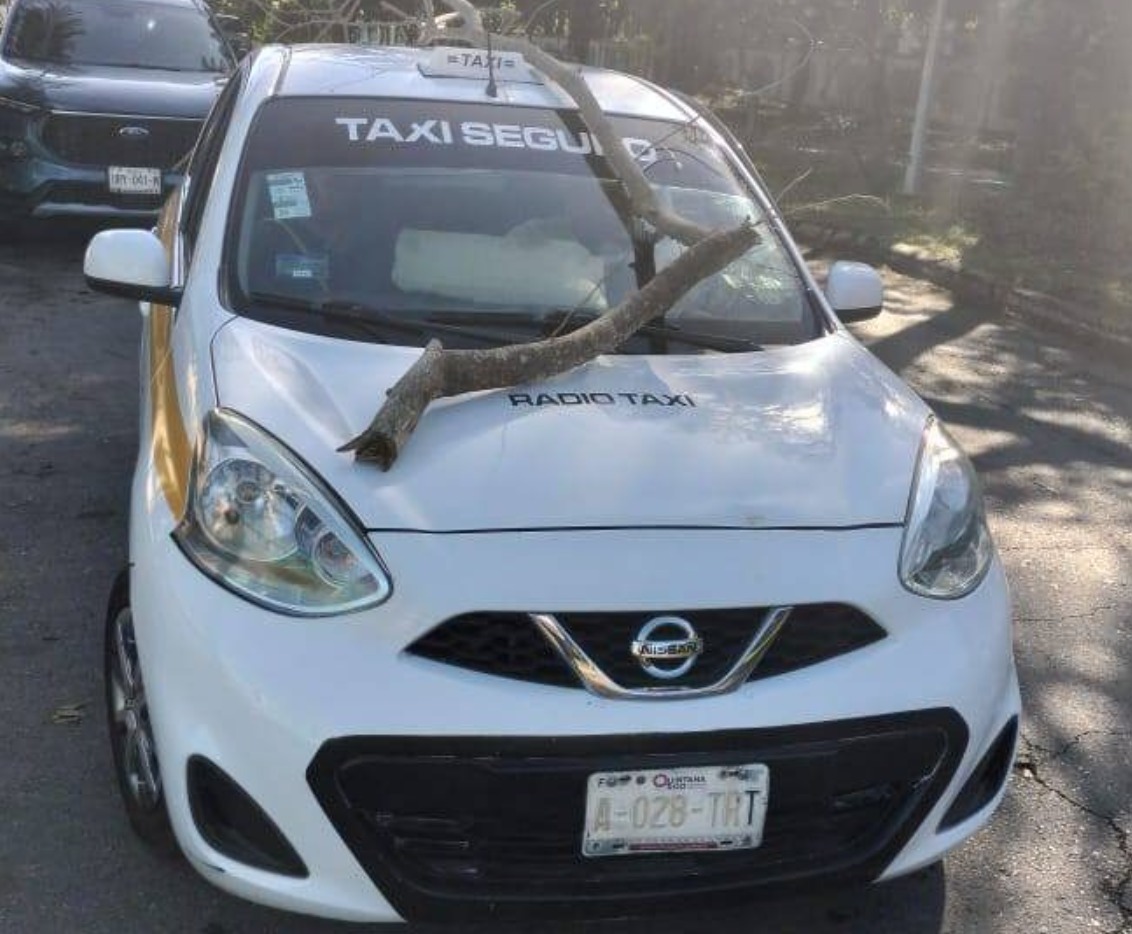 CHETUMAL, 10 de enero. – Un taxi marcado con el número económico 77 resultó severamente dañado luego de que una pesada rama cayera de forma repentina sobre la unidad, mientras circulaba sobre la avenida Álvaro Obregón López Mateos, entre las calles Florencia y Milán, en la ciudad de Chetumal. El incidente ocurrió sin previo aviso y generó alarma entre automovilistas y peatones que se encontraban en la zona.