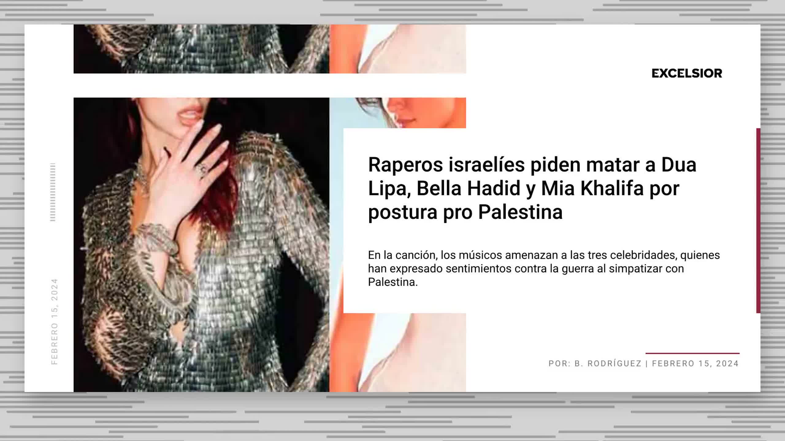 Dos raperos israelíes están pidiendo acabar con la vida de celebridades de origen musulmán, entre estas, Dua Lipa, la modelo Bella Hadid y la ex estrella de cien para adultos Mia Khalifa, en una controvertida canción de rap que ya se convirtió en himno de guerra no oficial de su país.