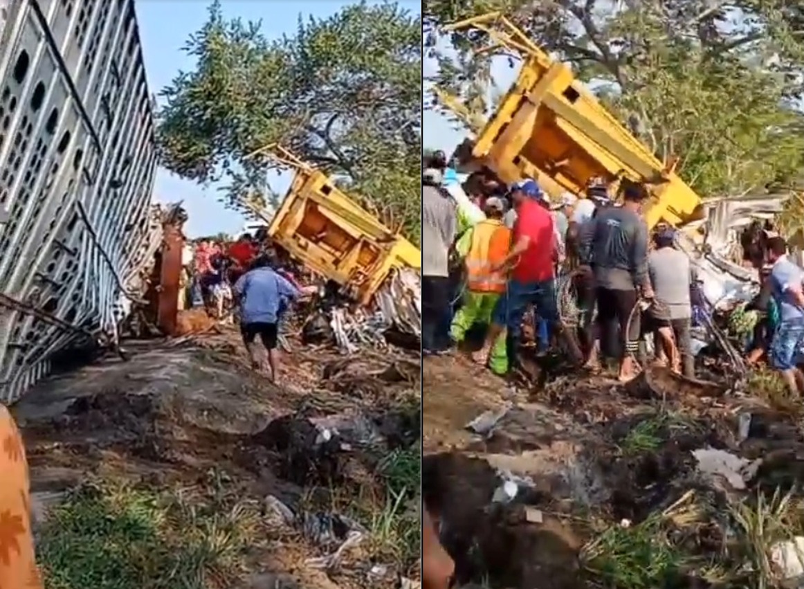 El trailer derribó el puente y lamentablente se volcó saliendose de la cinta asfáltica, por lo que la rapiña no se hizo esperar.