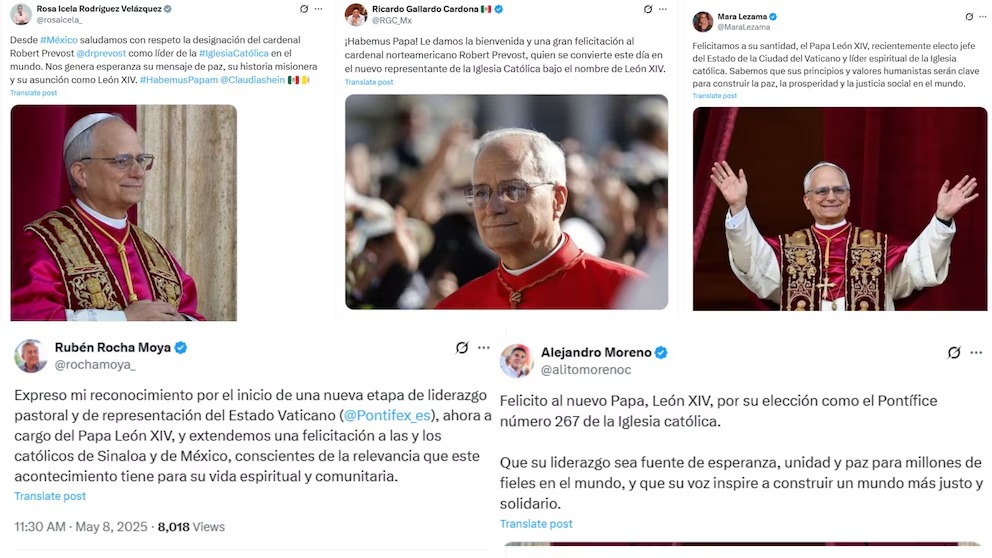 • Rubén Rocha Moya, gobernador de Sinaloa: “Expreso mi reconocimiento por el inicio de una nueva etapa de liderazgo pastoral y de representación del Estado Vaticano, ahora a cargo del papa León XIV. Extendemos una felicitación a las y los católicos de Sinaloa y de México”.