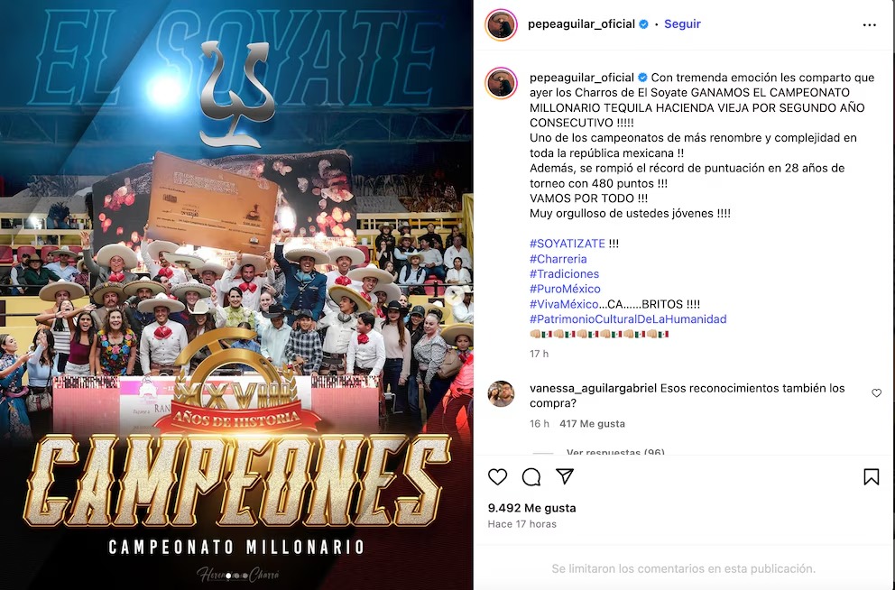 “Con tremenda emoción les comparto que ayer los Charros de El Soyate GANAMOS EL CAMPEONATO MILLONARIO TEQUILA HACIENDA VIEJA POR SEGUNDO AÑO CONSECUTIVO !!!!! Uno de los campeonatos de más renombre y complejidad en toda la república mexicana !! Además, se rompió el récord de puntuación en 28 años de torneo con 480 puntos !!! VAMOS POR TODO !!! Muy orgulloso de ustedes jóvenes !!!!”, publicó el cantante, sin hacer referencia directa al conflicto con su hijo mayor.