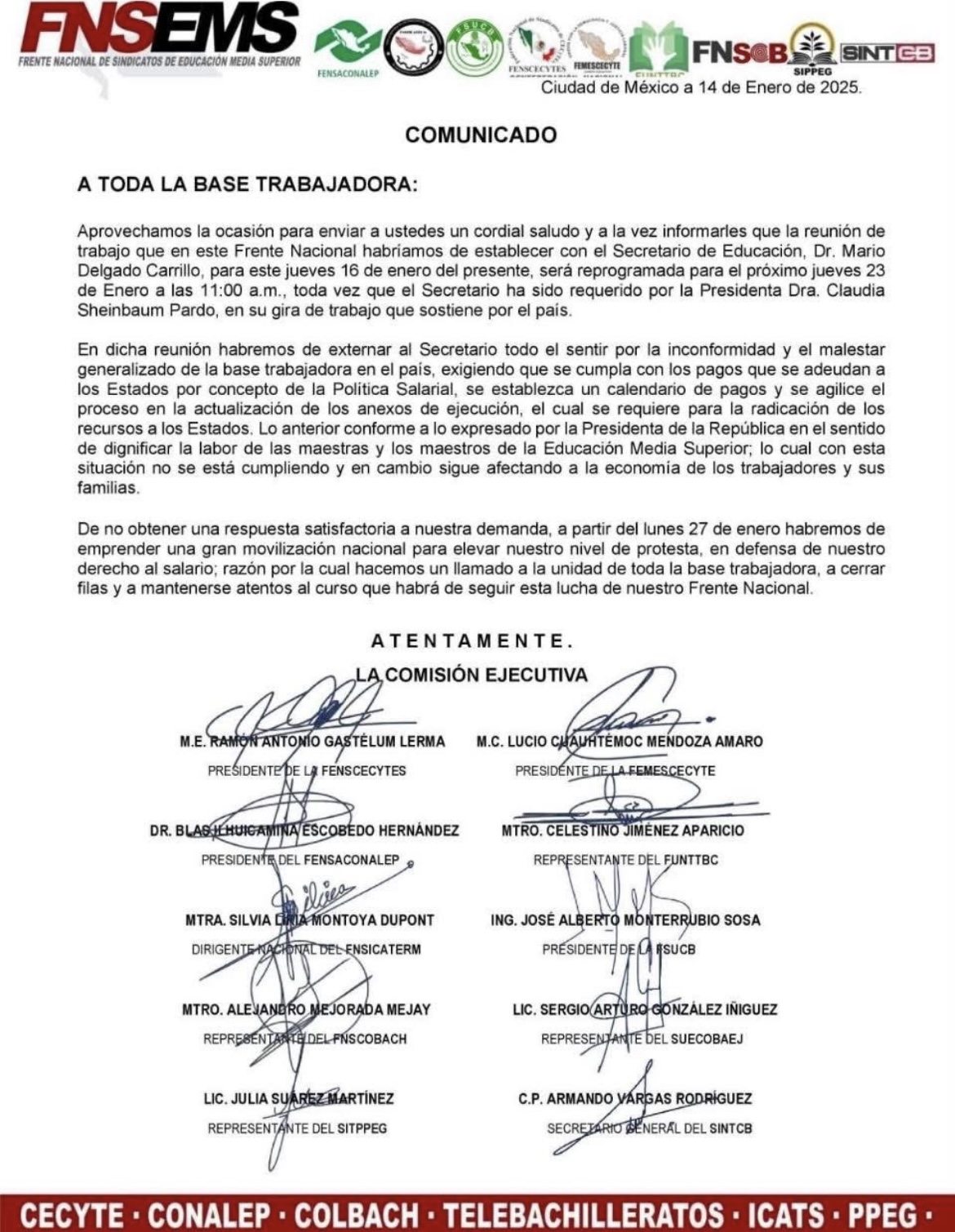 De acuerdo con la información que ha proporcionado el Frente Nacional de Sindicatos de Educación Media Superior (FNSEMS), lograron una audiencia con el Secretario de Educación Pública Mario Delgado Carrillo, a quien le externarán las inconformidades y el malestar generalizado de la base trabajadora, por el incumplimiento de los pagos que se les adeudan y exigirán que se establezca un calendario de pagos y el firme compromiso de que no habrá más retrasos para recibir sus remuneraciones.