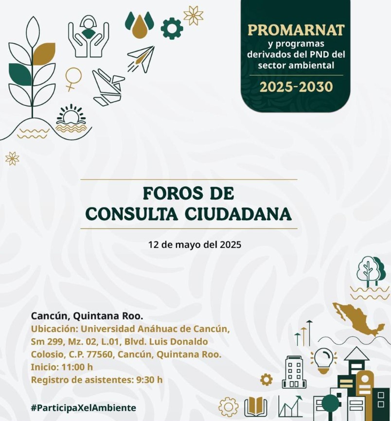 La Semarnat convoca a las organizaciones obreras, campesinas y de la sociedad civil, pueblos originarios, instituciones académicas, organismos empresariales, jóvenes, mujeres, personas adultas mayores, personas con discapacidad y población en general a participar en los foros, que recopilarán propuestas para articular objetivos, estrategias y líneas de acción del programa sexenal de su sector. Las propuestas serán recabadas en las mesas de trabajo presenciales o entregadas por escrito durante los foros el 12 de mayo, o en línea a través de la plataforma digital Consulta Ciudadana del Sector Ambiental, disponible del 6 al 12 de mayo de 2025 en el sitio web https://gisviewer.semarnat.gob.mx/foros25/consultaCiudadana.html.