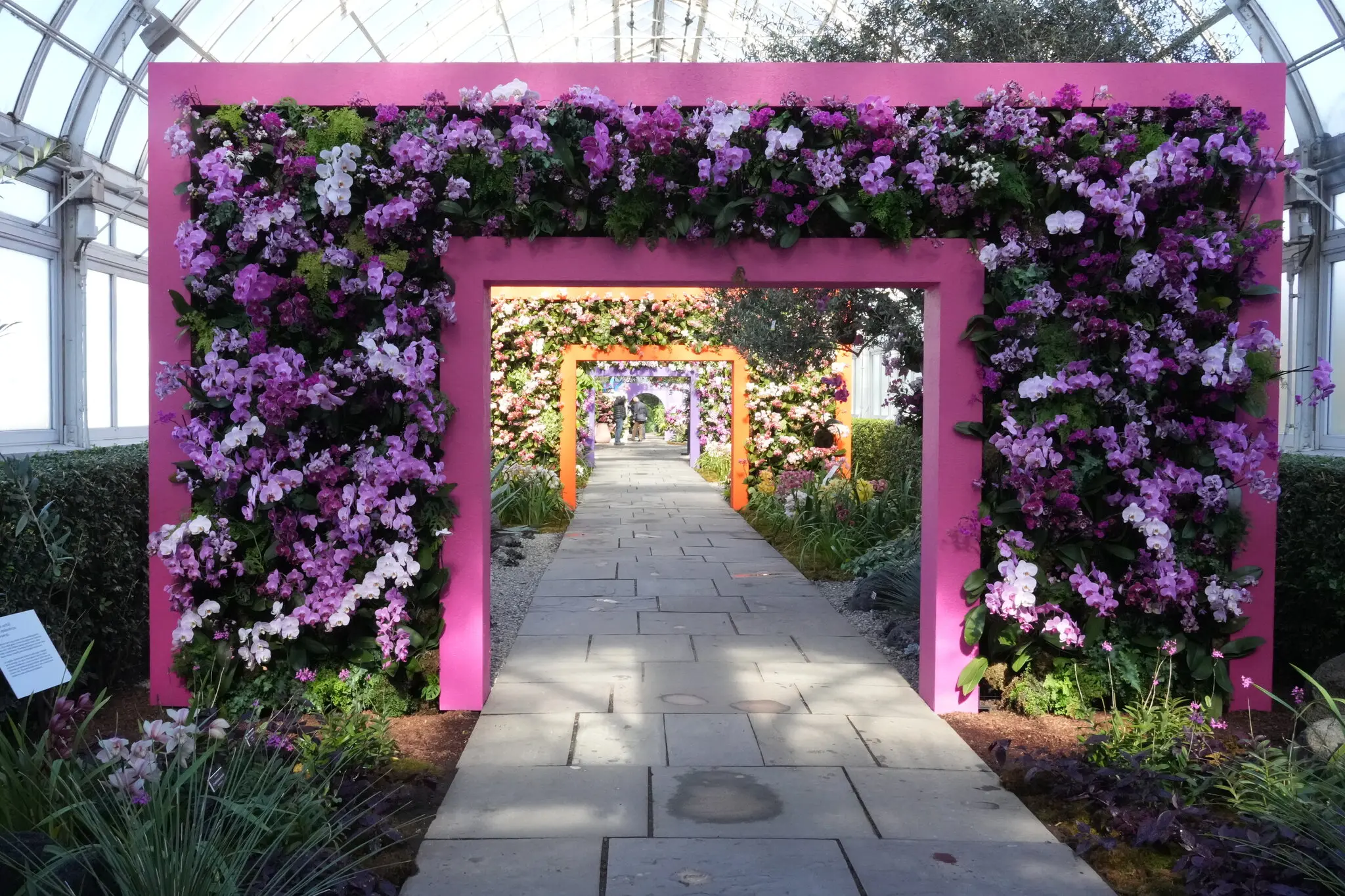 Por eso, aunque las propias instalaciones inspiradas en Barragán se ciñen a una gama relativamente estrecha de estilos florales, las orquídeas que se han esparcido cuidadosamente por el resto de enredaderas, palmeras y cactus instalados permanentemente son tan variadas que si, como yo, vienes con la intención de tomar notas, saldrás mareado y aturdido.