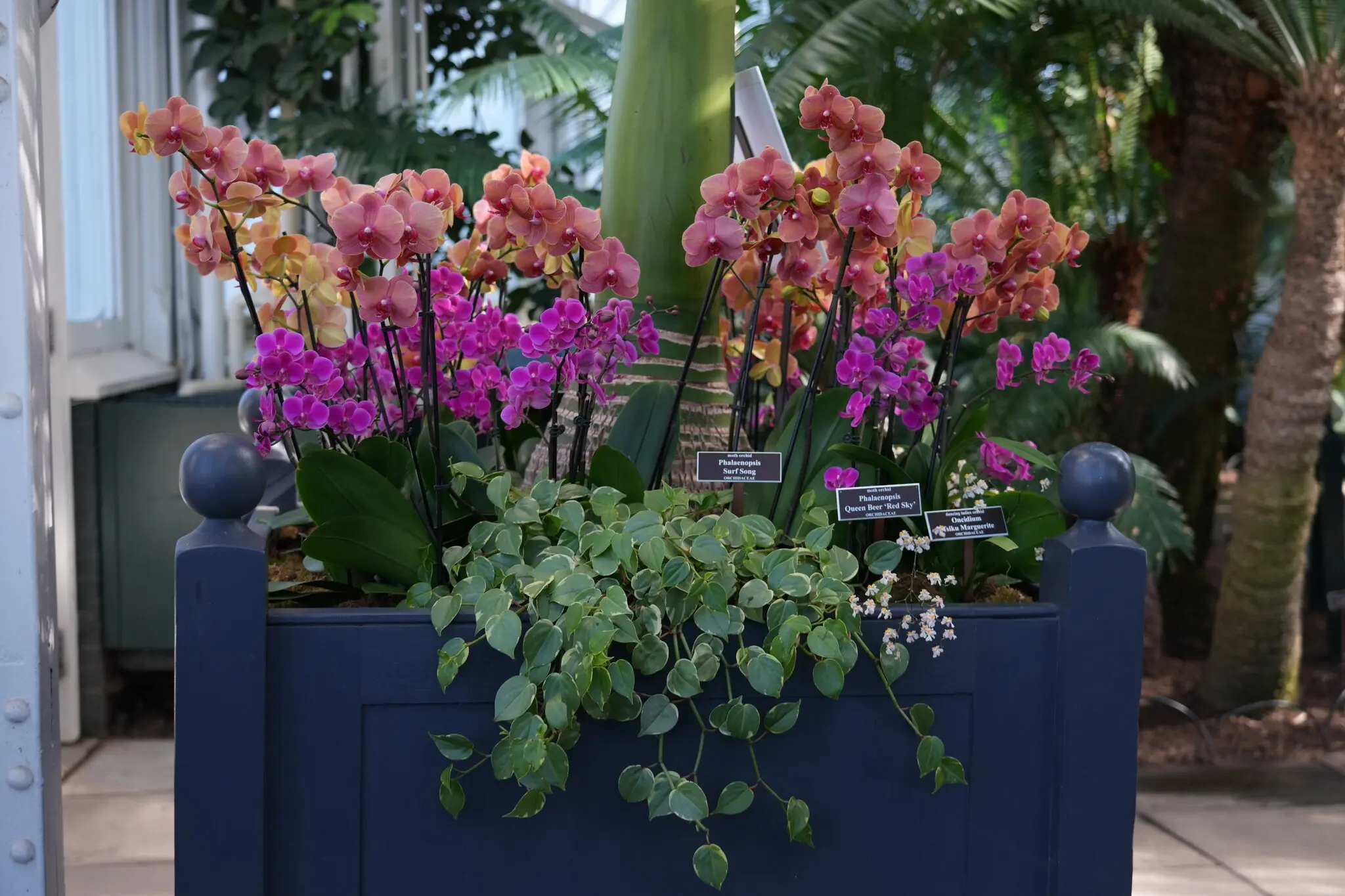 La Phalaenopsis, conocida como la orquídea de supermercado, es originaria del sudeste asiático, pero como ha sido la más ampliamente hibridizada, es la que presenta mayor variedad de colores. También se exponen especies originarias de México, como las fragantes pero pequeñas orquídeas vainilla, o Vainilla planifolia, que proporciona las minúsculas motas negras de tu Häagen-Dazs de vainilla, y que fue cultivada por primera vez por los aztecas.