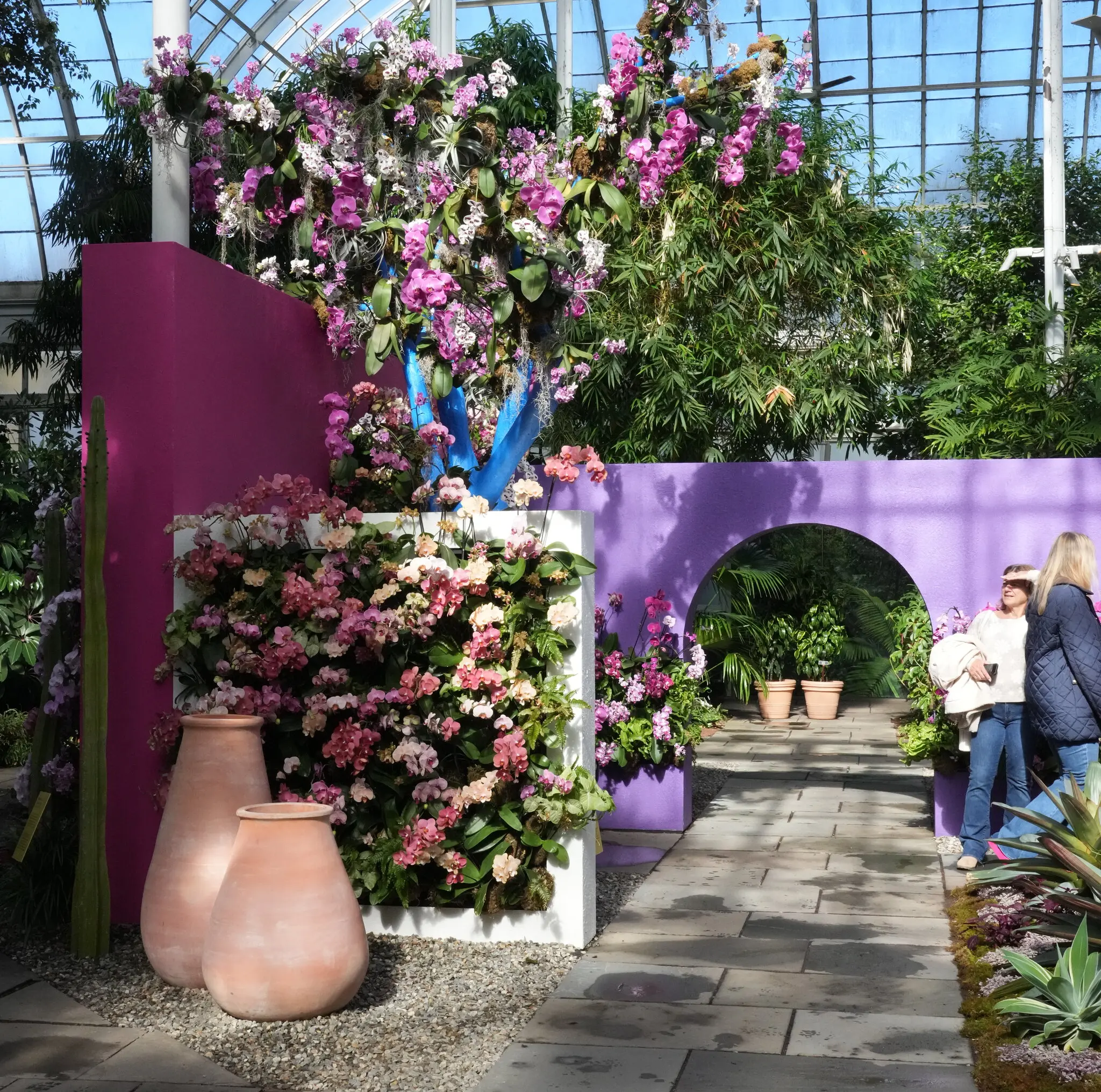 Por eso, aunque las propias instalaciones inspiradas en Barragán se ciñen a una gama relativamente estrecha de estilos florales, las orquídeas que se han esparcido cuidadosamente por el resto de enredaderas, palmeras y cactus instalados permanentemente son tan variadas que si, como yo, vienes con la intención de tomar notas, saldrás mareado y aturdido.