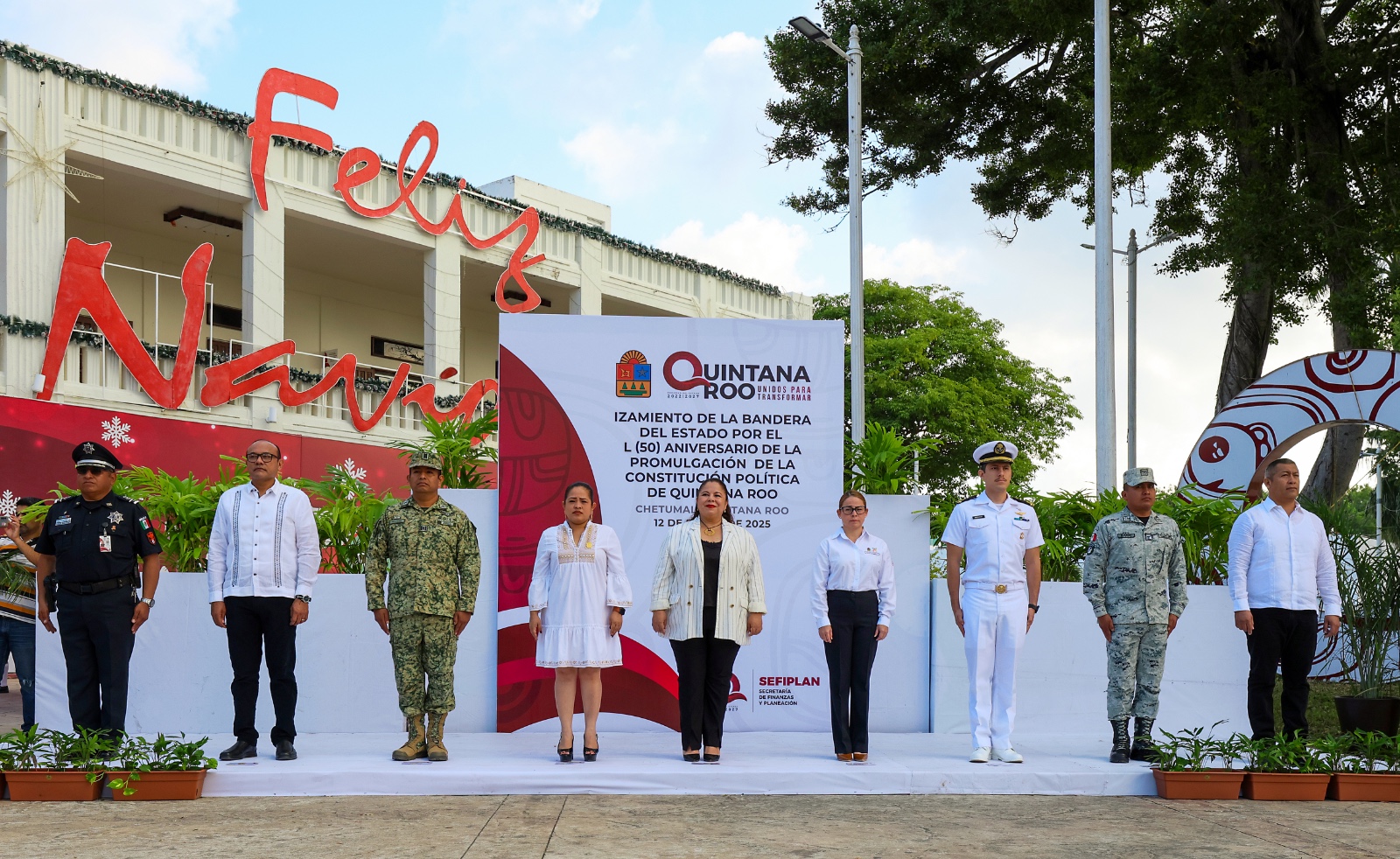 Chetumal.- En cumplimiento a la Ley que rige la creación de la Bandera del Estado, en la cual marca que este día 12 de enero fecha solemne para Quintana Roo, se llevó a cabo el izamiento de la Bandera de Quintana Roo, con el cual el Gobierno del Estado, conmemoró el 50 Aniversario de la Promulgación de la Constitución Política de Quintana Roo.