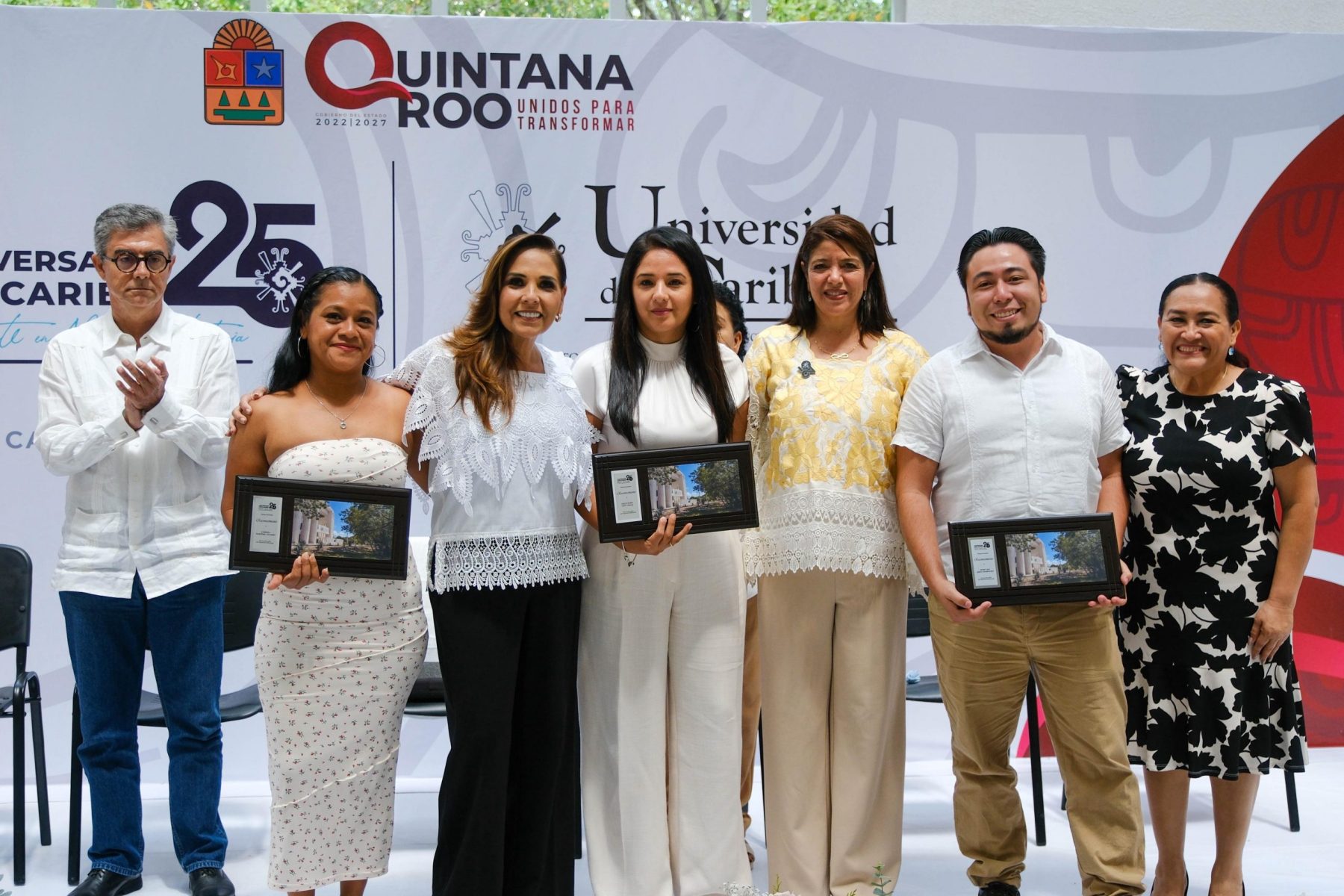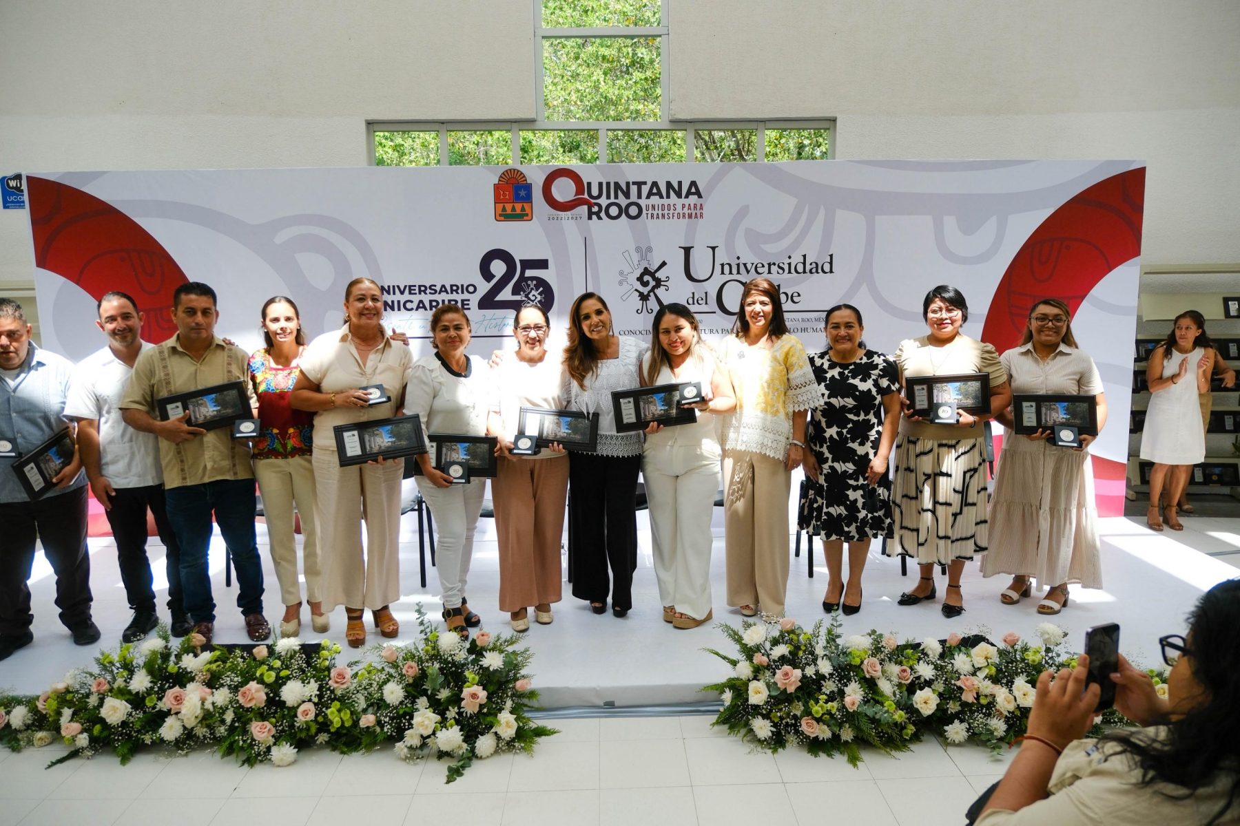 Cancún.- La gobernadora Mara Lezama Espinosa encabezó la celebración del 25 Aniversario de la Universidad del Caribe (UNICARIBE) que este año tiene el tema: “Presente en nuestra historia”, en un evento en el que se reconoció al personal que ha hecho de esta Universidad un pilar de la educación superior.