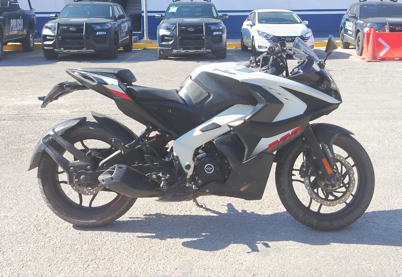 En el fraccionamiento Villas del Sol, durante un recorrido de vigilancia fue localizada mal estacionada una motocicleta marca Bajaj, tipo Pulsar NS200, color blanco con negro y sin placas de circulación y aparentemente abandonada. Al verificar el número de serie con la plataforma C4, se confirmó que contaba con reporte de robo vigente en el municipio de Tulum, ocurrido el pasado 8 de mayo. La unidad presentaba daños visibles en el switch y una raspadura en el costado derecho.