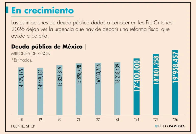 La deuda pública medida por el Saldo Histórico de los Requerimientos del Sector Público (SHRFSP) ascenderá a 20.3 billones de pesos en 2026, 52.3 % del PIB.