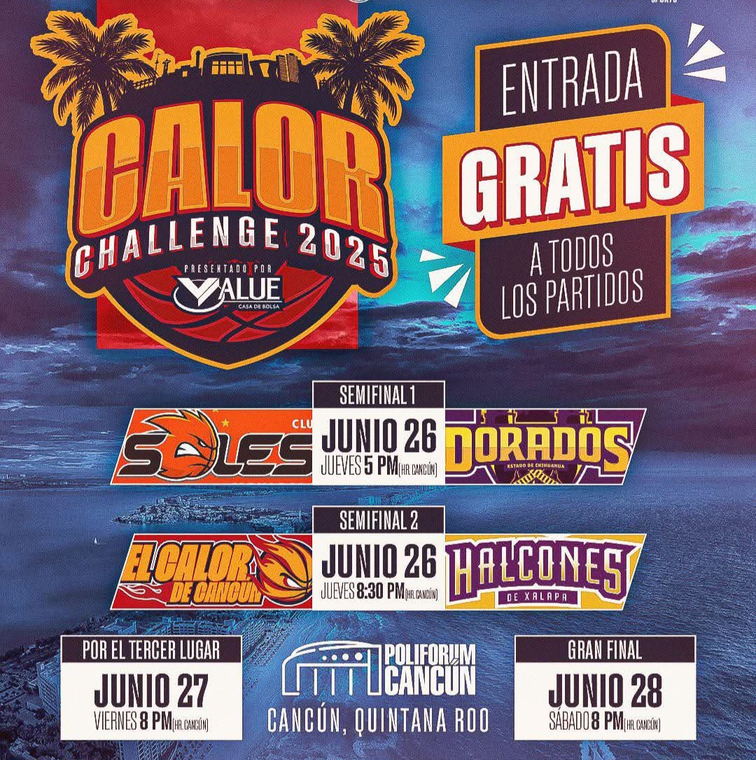 CANCÚN, Q. ROO a 25 de junio.- A escasos diez días de que se ponga en marcha la Temporada 2025 de la Liga Nacional de Baloncesto Profesional (LNBP) Caliente.Mx, cuatro de los 16 equipos participantes en este circuito basquetbolero, estarán el fin de semana en el “Poliforum Cancún” del boulevard Luis Donaldo Colosio del -Caribe Mexicano-, para participar en un Torneo Relámpago de Pretemporada, denominado -Challenge Cancún-, el cual constará de cuatro partidos, todos con acceso gratuito a los aficionados.
