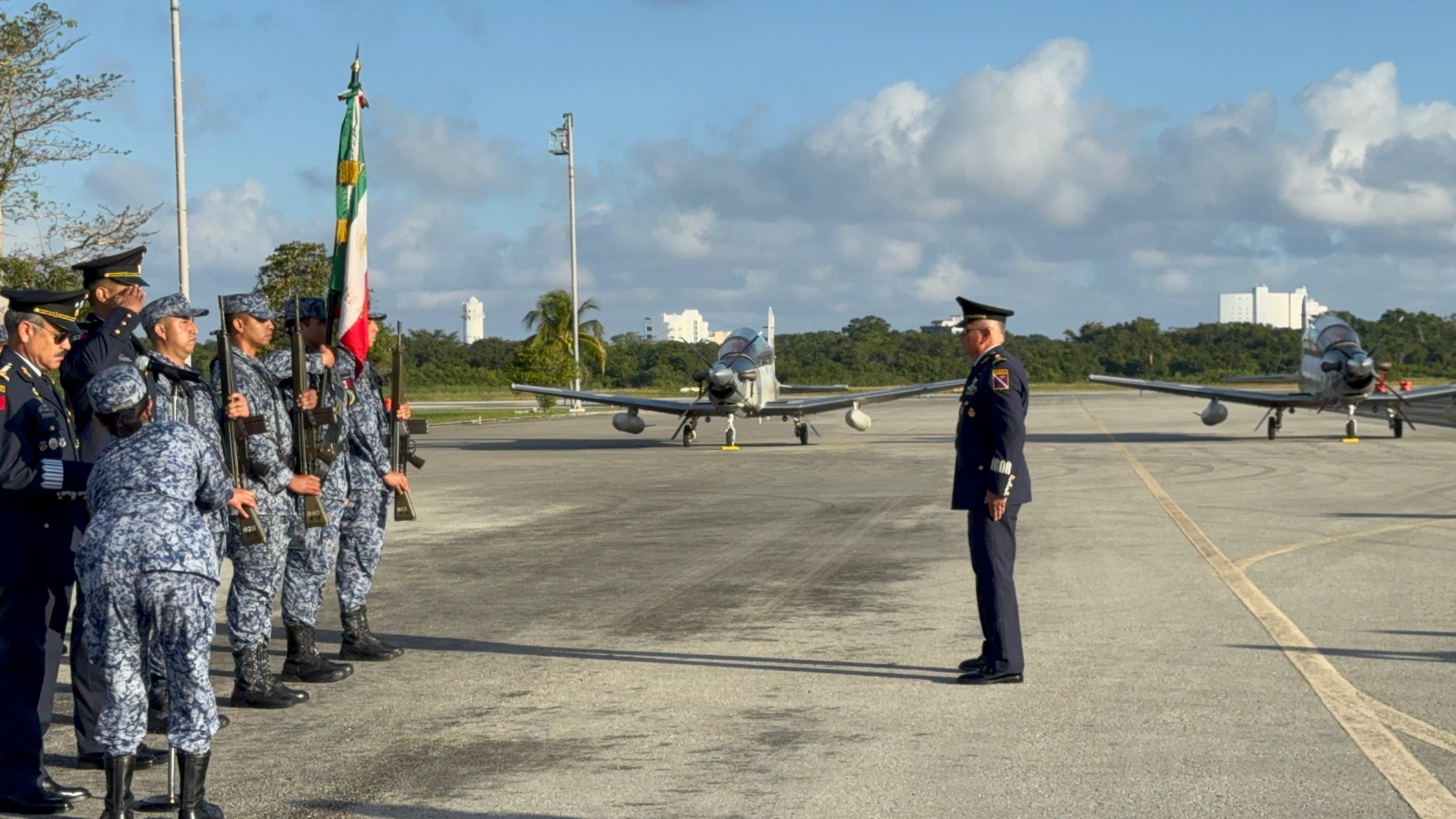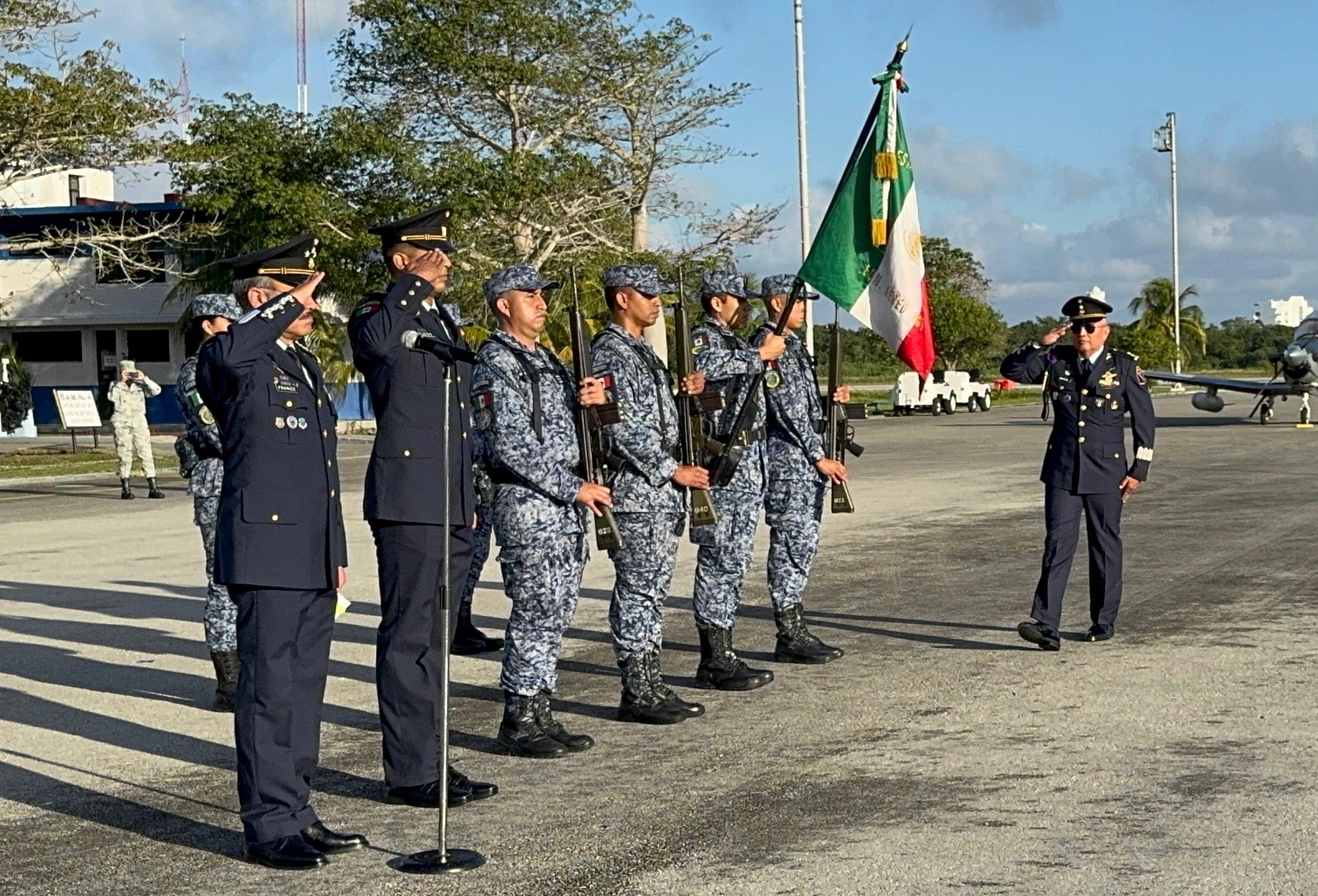 Cozumel, Q. Roo, 1 de febrero.- En emotiva ceremonia realizada en la Base Aérea Militar, la mañana de este sábado rindió protesta y tomó posesión el General de Grupo, Piloto Aviador de Estado Mayor, Jesús Bautista a la Torre, como comandante interino de esta Base Aérea Militar Número 4.