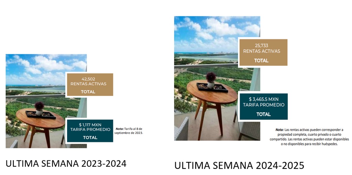 De acuerdo al reporte que otorga la Sedetur cada semana, se refiere que en la última semana del 2023, se traían en el Caribe Mexicano, un promedio de 42 mil 500 habitaciones activas en renta vacacional en todo el estado, siendo Cancún y Playa del Carmen los destinos con la mayor oferta de este tipo de hospedaje, pero también destacando Tulum, donde esta oferta ya rebasaba la oferta de la hotelería tradicional.